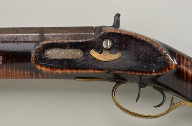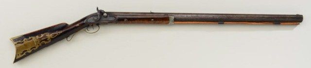 Tiger stripe maple percussion heavy barrel half-stock percussion rifle, .60 cal., 34” octagon barrel measuring 1” in diameter, beautiful brass patchbox with double set triggers (working at time of description),brass trigger guard and butt plate with pewter fore end cap; barrel marked “Lansingb___”; possible manufacture by J.M. Caswell of Lansingburgh (now Troy), located in the Hudson River Valley (former home ofMohican Tribe), Rensselaer County, New York. Casewell was the son of Thomas Caswell who made muskets for the NY State Militia; John M. Casewell carried on the business until 1836 according to Carey’s “American FirearmsMakers”. Barrel shows an uncleaned dark patina, good action, beautiful patina to wood stock with a number of pierced inlays of stars on the left side of the butt stock, hearts on the fore end that shows an oldslight crack along the right side of the fore end and a pierced plaque on the left side of the stock at the breech inscribed “E. Ronler”. A beautiful piece that shows transitional characteristics of