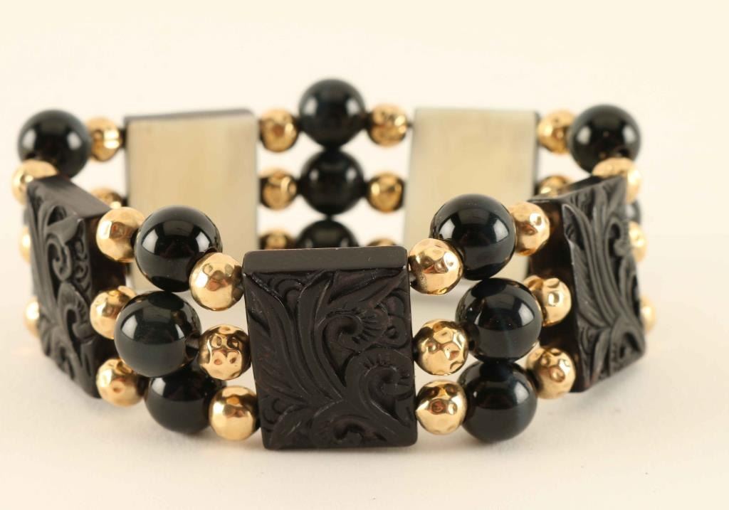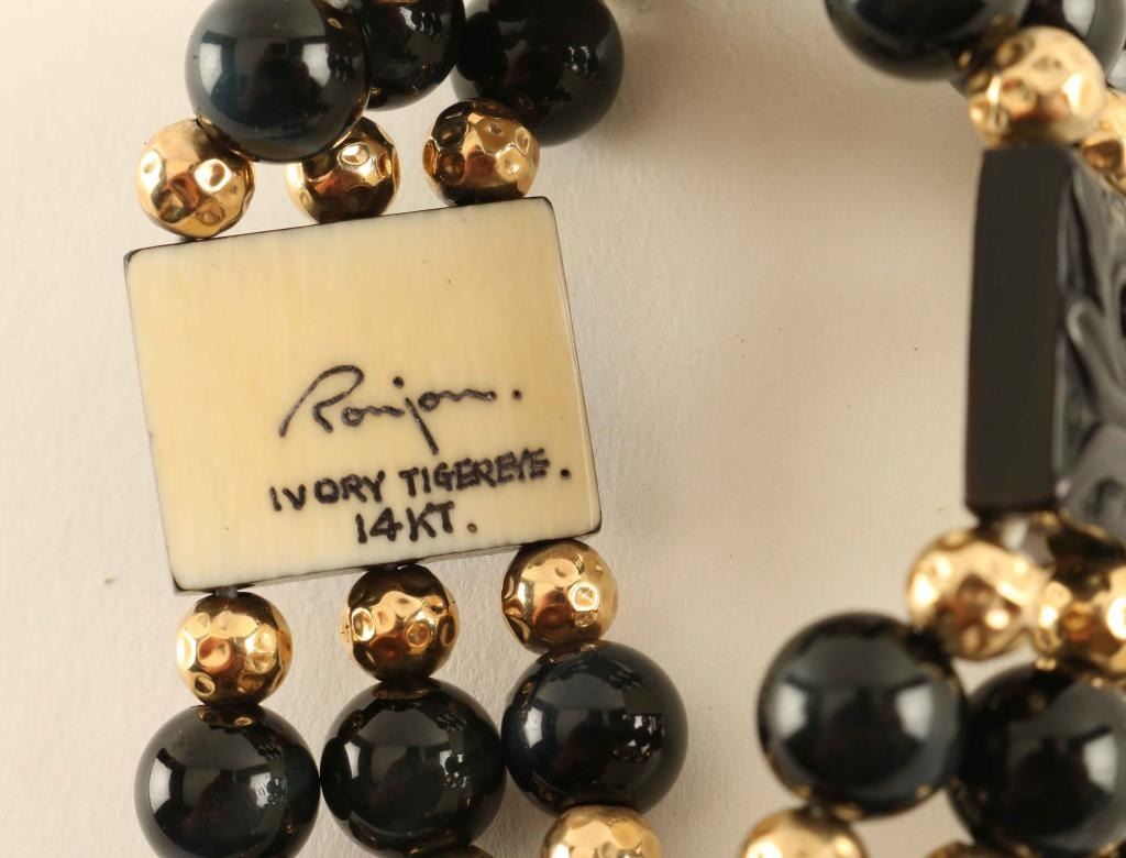 Black and white carved design beads with gold plated beads in between marked Ronjon14k.