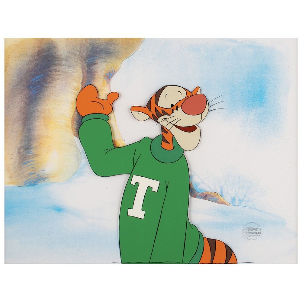 (Walt Disney Studios, 1988) Original production cel featuring Tigger from The New Adventures of Winnie the Pooh, showing him in a green "T" sweater. The cel is placed on a color copy background. Image measures 6 x 6.75, with a mat opening of 11 x 8.5. Framed to an overall size of 19 x 17, with a Disney certificate affixed to the reverse. The piece has the silver Walt Disney Company seal to lower right. In fine condition.