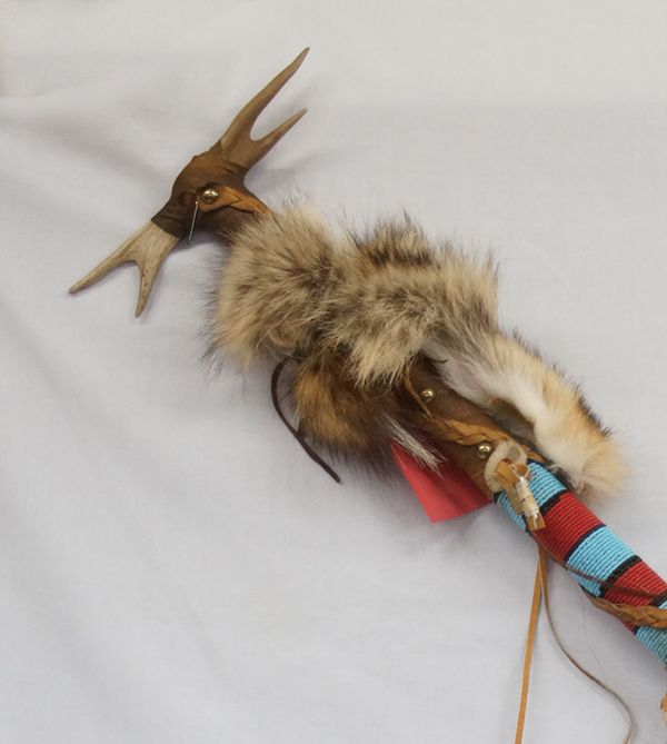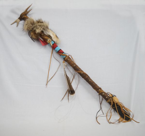 Tigua Pueblo Indian Trail Marker made by Marty and Terry Pein, comes with COA, embellished with coyote fur, antlers, beadwork, feathers, horse hair, leather fetish bag, brass brads, leather wrapped shaft, leather fringe, and metal blade on bottom to secure in the ground, nice piece, measures 43''L x 9''W