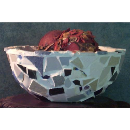 This beautiful fruit bowl is inlaid with a splendid and colorful arrangement of porcelain tile, pottery, and china pieces. The bowl is 12" across and stands 6" high. What a work of art and a real conversation piece.