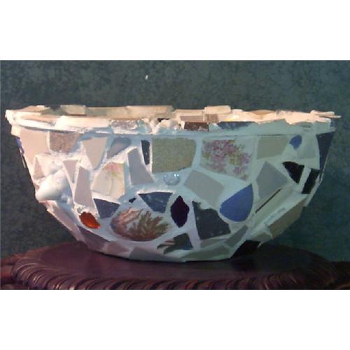 </font></strong>This beautiful fruit bowl is inlaid with a splendid and colorful arrangement of porcelain tile, pottery, and old china pieces. The bowl is 12" across and stands 6" high. What a work of art and a real conversation piece.</font>