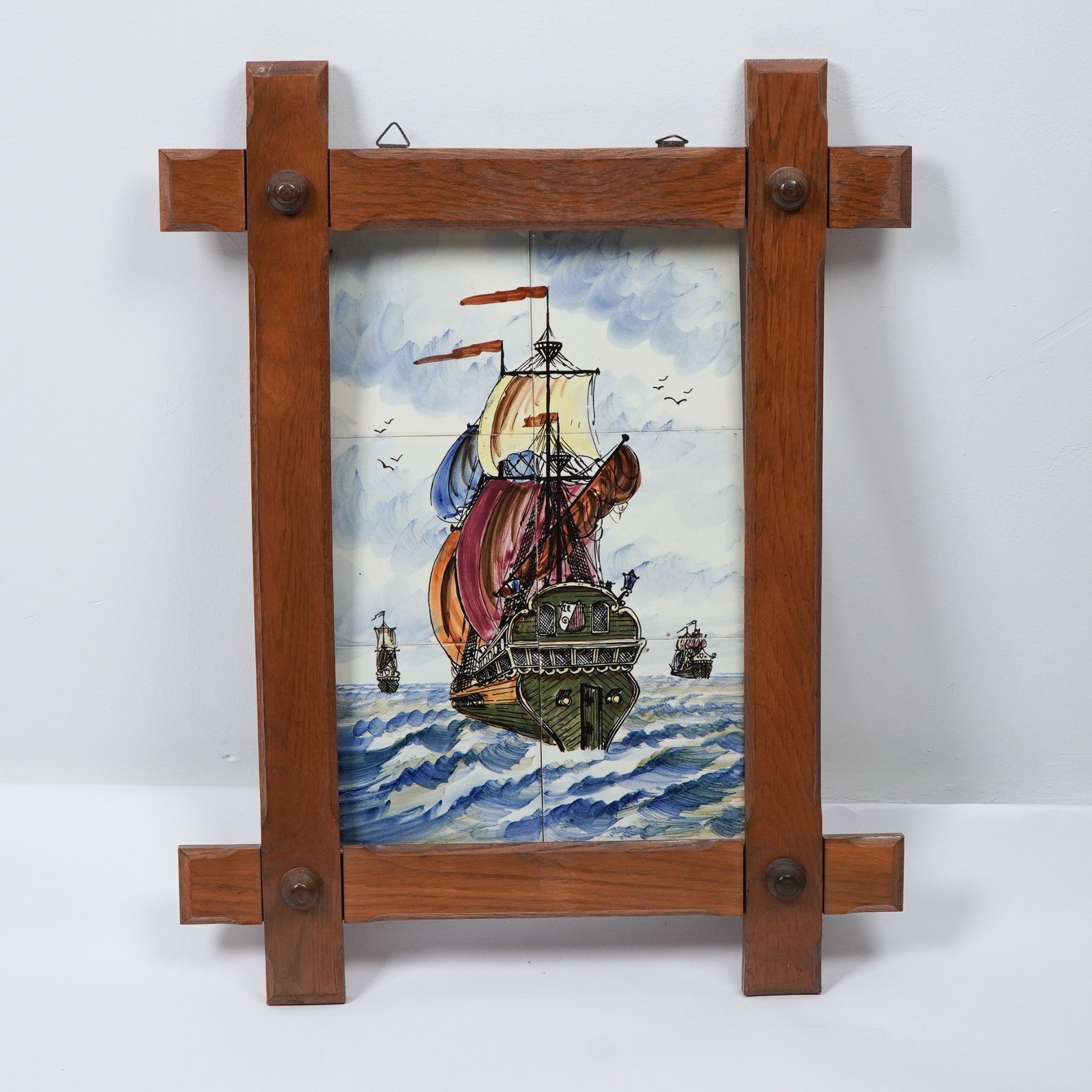 This striking 6-tile artwork features a majestic tall ship sailing through the open seas, framed in a rustic wooden structure with metal accents. The vibrant colors bring the maritime scene to life, showcasing billowing sails, crashing waves, and a dramatic sky. The six ceramic tiles are carefully arranged to form a cohesive nautical image, making this a unique decorative piece. Frame measures: 20.75"L x 1.75"W x 27"H. Sight measures: 12"L x 18"H.