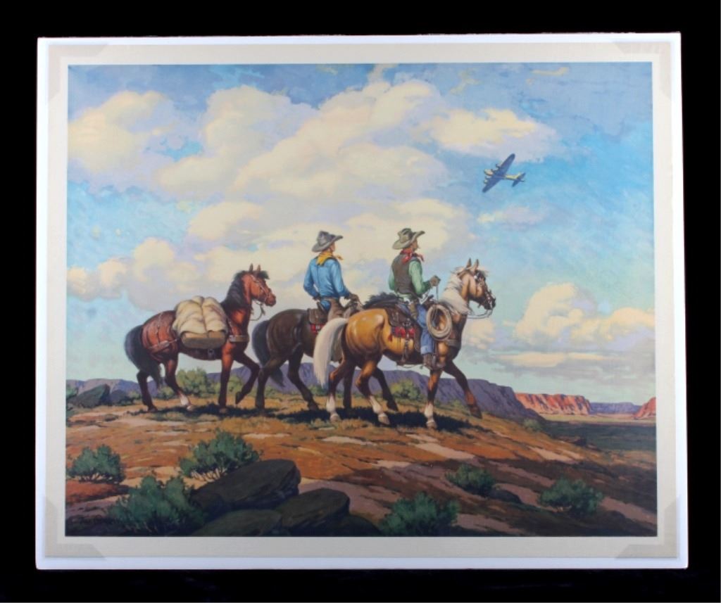 Featured in this lot we have a Till Goodan Westward Ho cowboy lithograph tilted "Bomber and Buckeroos" circa 1939. Goodan was an accomplished and successful Western artist in the early to mid 1900's. His most notable works were the Westward Ho designs he created for dinnerware that show Western scenes. This print depicts a pair of cowboys on horseback with an airplane flying overhead. The print is in good condition and shows the artist's signature. The piece measures 26" x 31.5".