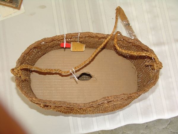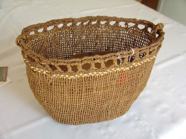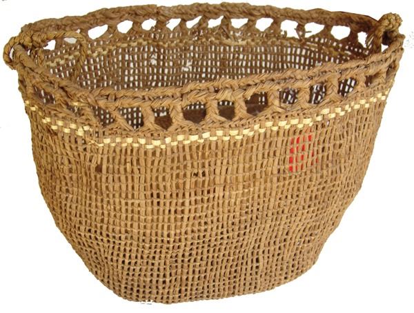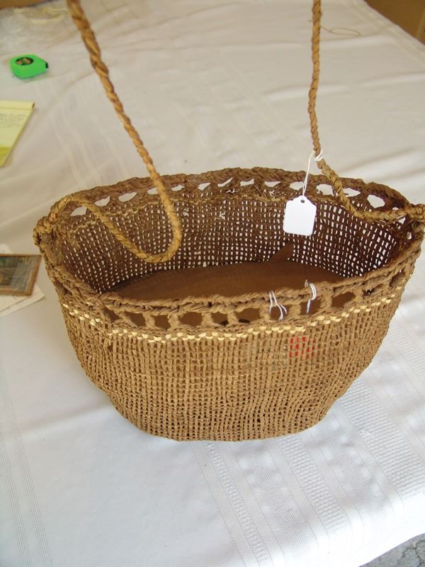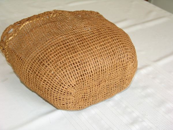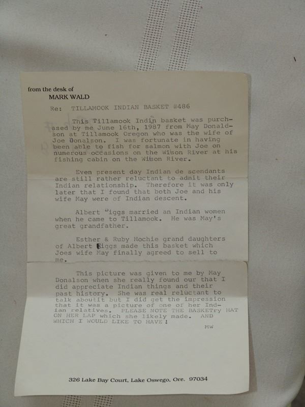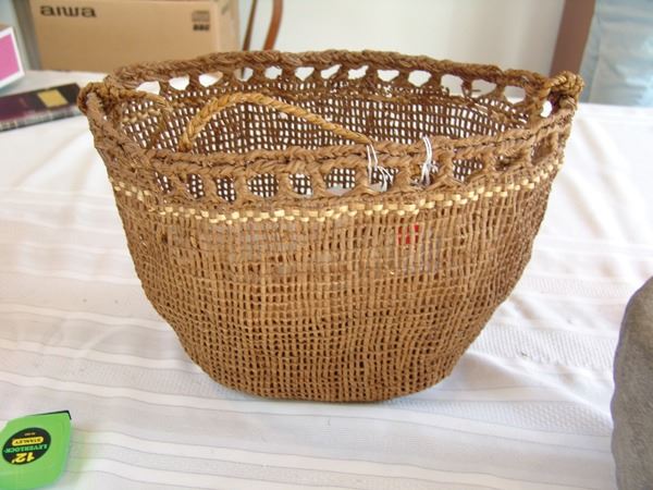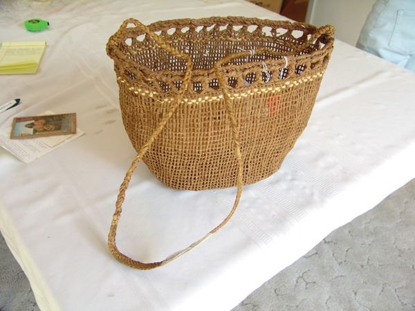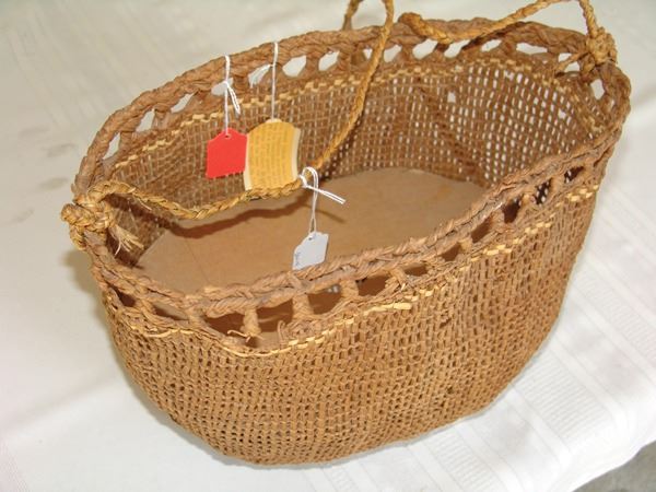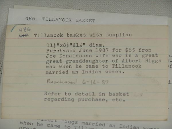 Unusually large, rectangular, open weave clamming basket with openwork rim, purchased in Tillamook in 1967 for $65.00. Includes original tumpline. Very good condition. Ex. Mark Walk Collection