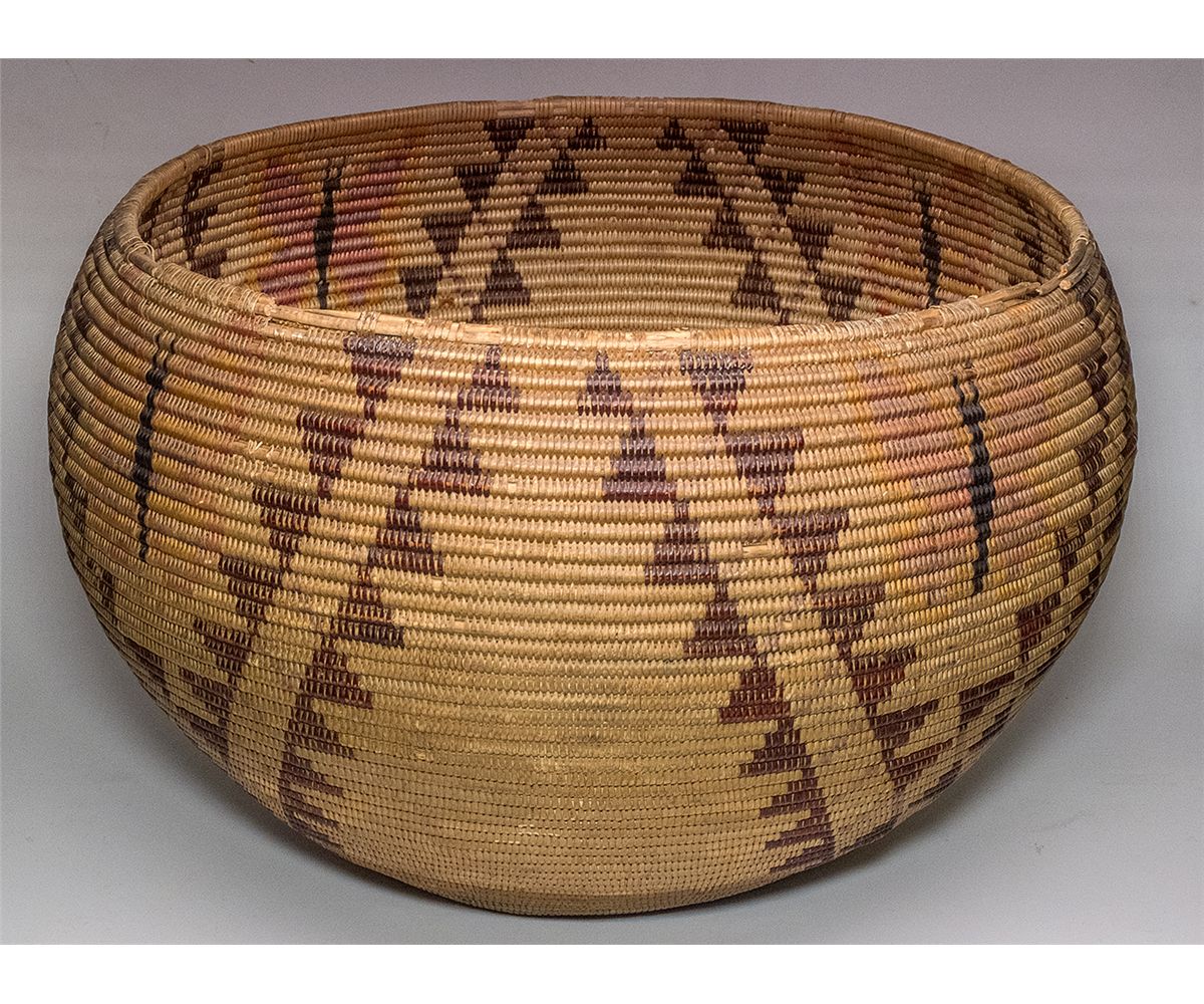 c1910 This basket is 14.25" in diameter and 9.25" high and about 12 stitches per inch. The materials used in the design consist of redbud, dyed and natural willow. There is some wear on basket and fading. Accompanying this lot is a letter of certification from Prof. Marvin Cohodas from the University of British Columbia. The document reads as follows "This is the only basket I have seen by Tillie Snooks that includes either dyed material or figurative deigns (the butterfly)...however the arrangement of design, basket shape, and stitching technique are unmistakably the product of Tillie Snooks" - HKA#65720