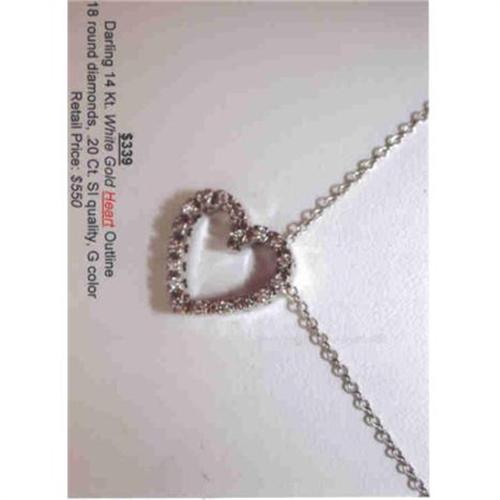 Delightful Tilted Heart Outline w/18 round diamonds in the channel. .20 Ct., SI Quality, G color or better. +/- 13.5 mm high x 15 mm wide