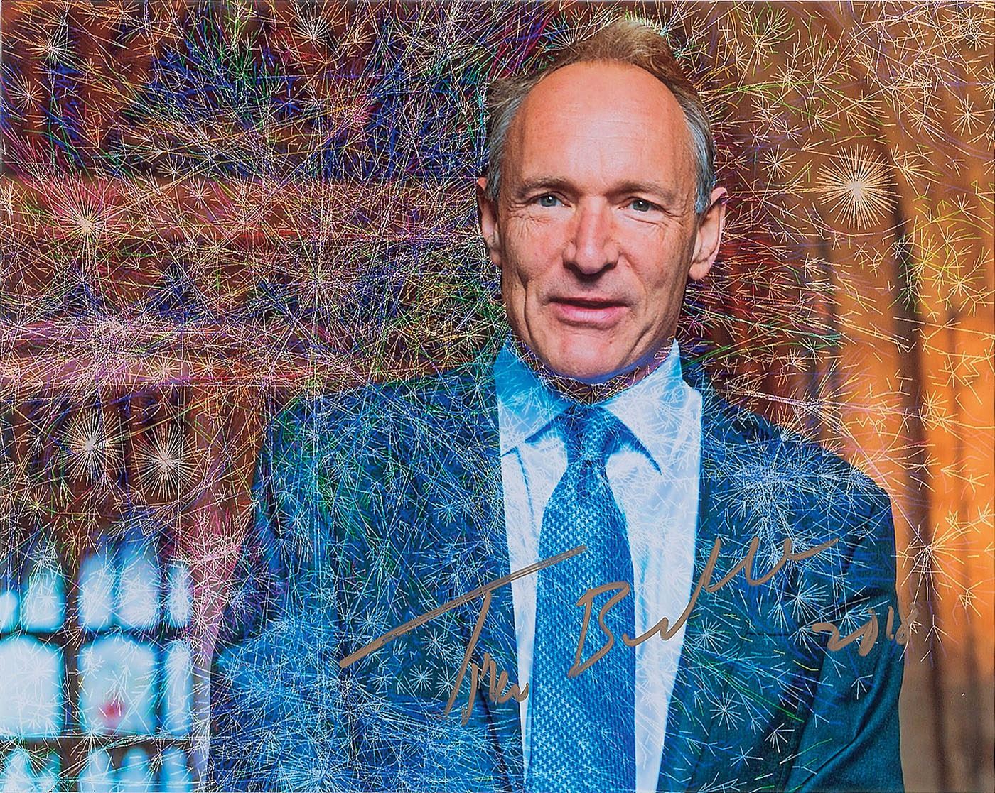 English engineer and computer scientist (born 1955) who is best known as the inventor of the World Wide Web. Color glossy 10 x 8 head-and-shoulders photo of Berners-Lee surrounded by a superimposed visualization of internet traffic, signed in gold ink, "Tim Berners–Lee, 2018." In very fine condition. Accompanied by a World Wide Web Consortium business card belonging to Berners-Lee, signed in black felt tip, "Best wishes, Tim Berners–Lee, 2018."