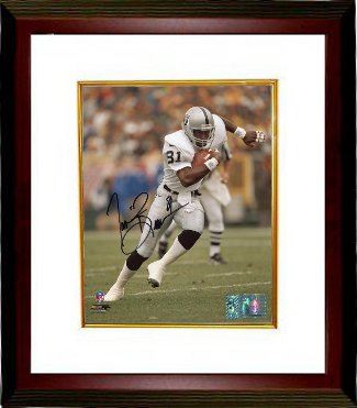 Tim Brown was selected by the Los Angeles Raiders with the 6th pick of the 1988 NFL Draft. In his first NFL season, he led the league in kickoff returns, return yards, and yards per return average. He also led the NFL in punt returns in 1994, and receptions in 1997. He was voted to the Pro Bowl nine times, in 1988 and 1991 as a kick returner, and in 1993-97, 1999 and 2001 as a receiver. In 2001, Brown would later play alongside another well-known wide receiver, Jerry Rice. On December 9, 2001, Brown returned a punt 88 yards for a touchdown in a home game against the Kansas City Chiefs, making him the oldest player in NFL history to score a touchdown on a punt return. Tim Brown has hand autographed this Oakland Raiders 8x10 Photo. Tri-Star Hologram and Certificate of Authenticity. Custom White Mat and Premium Mahogany Color Framed as shown.