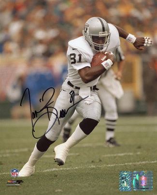 Tim Brown was selected by the Los Angeles Raiders with the 6th pick of the 1988 NFL Draft. In his first NFL season, he led the league in kickoff returns, return yards, and yards per return average. He also led the NFL in punt returns in 1994, and receptions in 1997. He was voted to the Pro Bowl nine times, in 1988 and 1991 as a kick returner, and in 1993-97, 1999 and 2001 as a receiver. In 2001, Brown would later play alongside another well-known wide receiver, Jerry Rice. On December 9, 2001, Brown returned a punt 88 yards for a touchdown in a home game against the Kansas City Chiefs, making him the oldest player in NFL history to score a touchdown on a punt return. Tim Brown has hand autographed this Oakland Raiders 8x10 Photo. Tri-Star Hologram and Certificate of Authenticity.