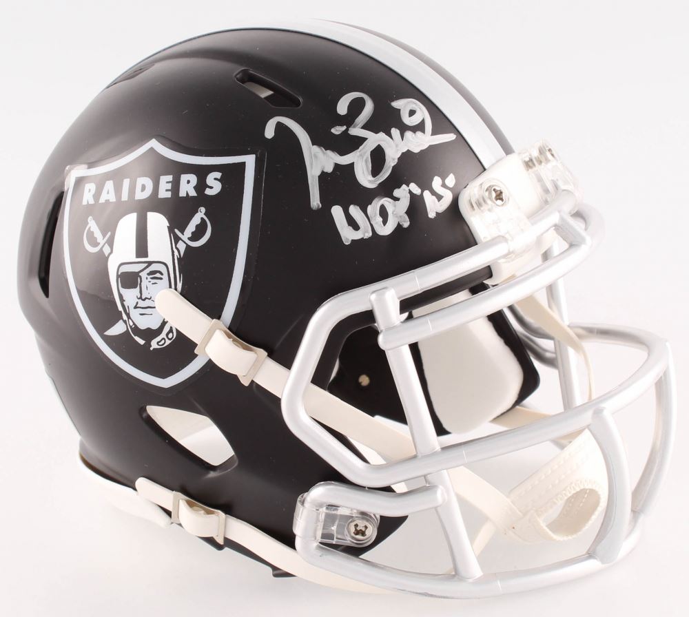 Riddell Raiders BLAZE mini-helmet. Hand-signed and inscribed in silver paint pen by Tim Brown (HOF).Â