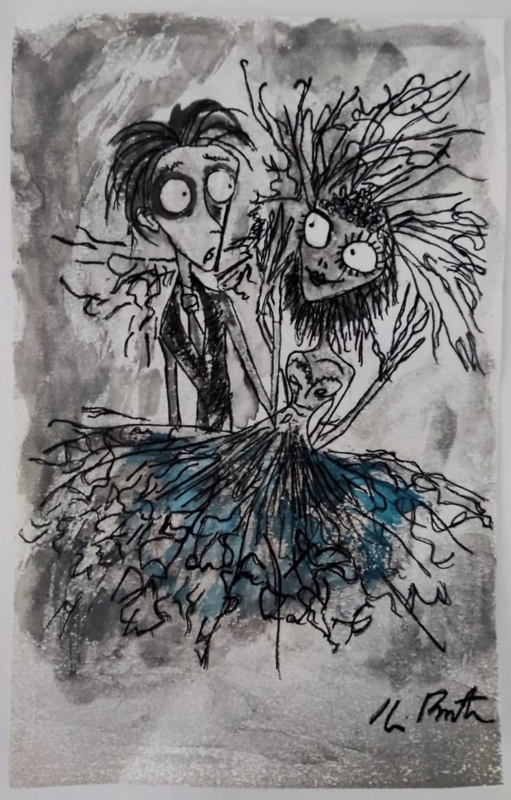 A drawing of Lock and Sally from 'corpse bride' hand drawing and signed by creator Tim Burton. 10x6.75 inches. Mounted and framed and supplied with coa.