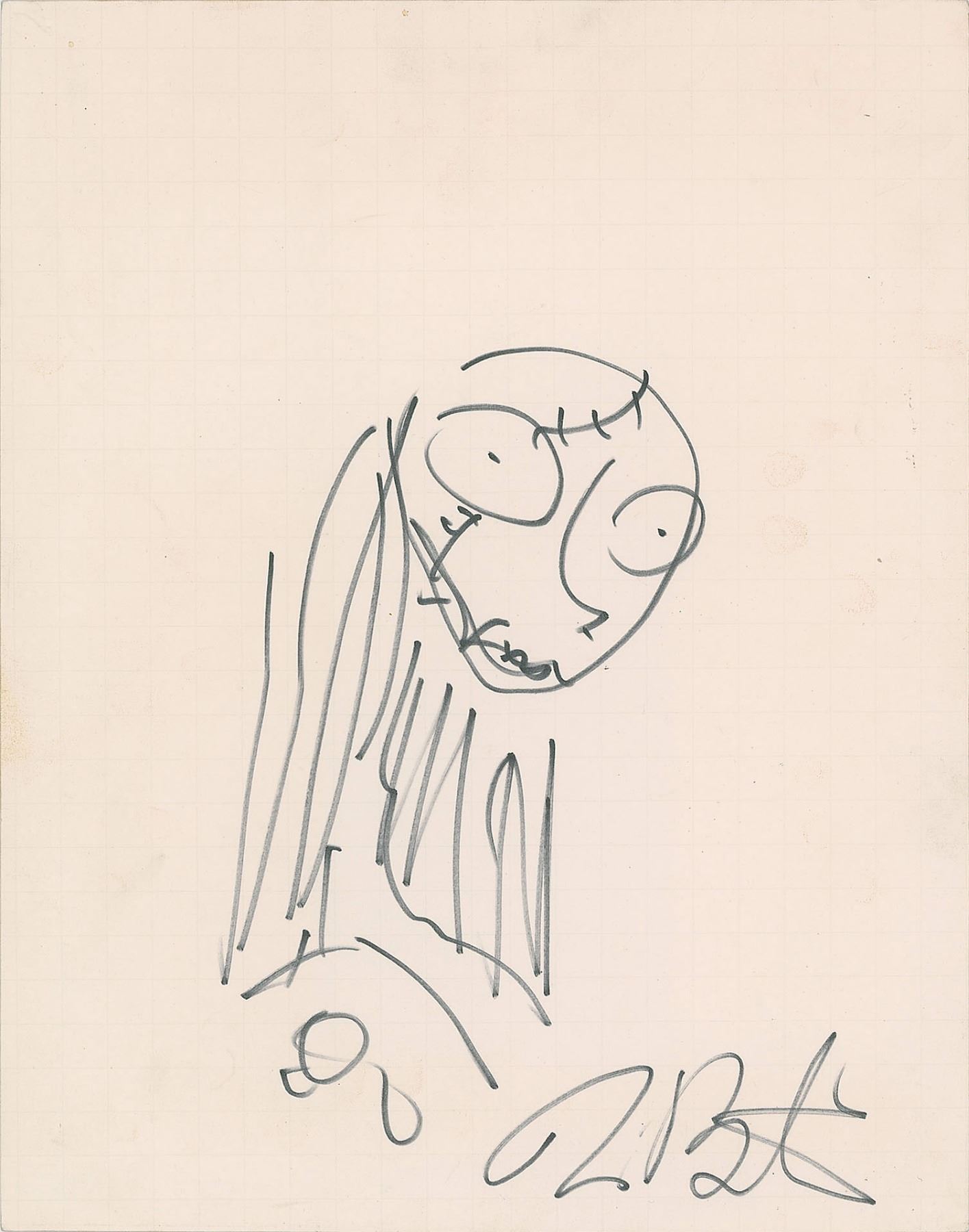 Original felt tip sketch of Sally from the 1993 animated dark fantasy The Nightmare Before Christmas on an off-white 11 x 14 sheet, signed below by Tim Burton. In fine condition, with some light staining to the left side.