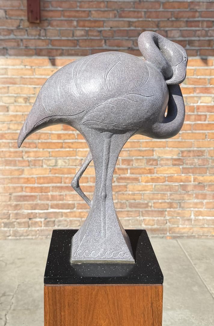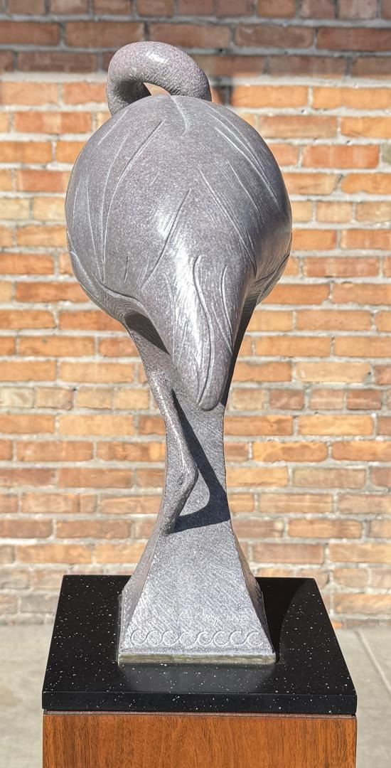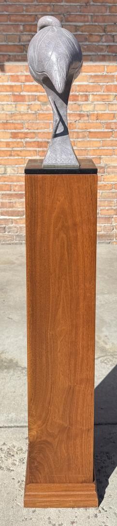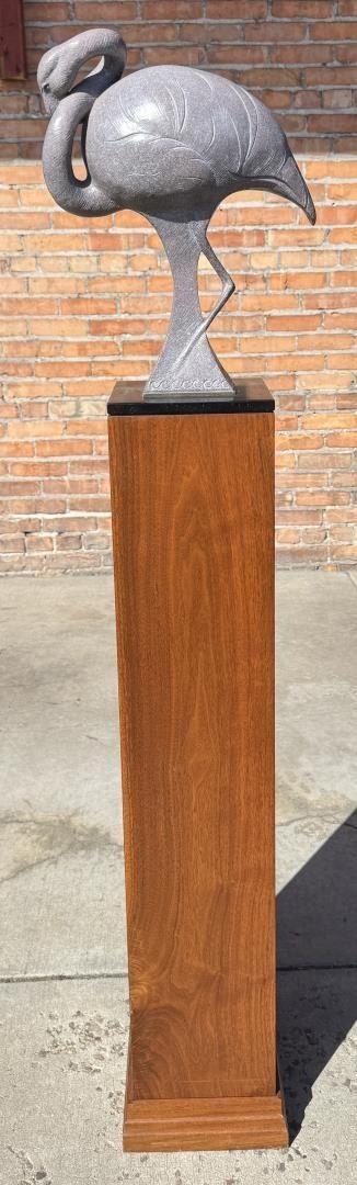 Title is Pink Repose. 58 1/2" by 13" by 9" on base. Tim Cherry (Born 1965) is active/lives in Missouri, Colorado, Alberta / Canada. Tim Cherry is known for Abstract wildlife and fish sculpture. A wildlife sculptor who depicts anatomy of animals realistically, Tim Cherry was born in Calgary, Alberta, Canada and grew up in the mining town of Nelson in British Columbia. At age 15, he became a wrangler and cook with an outfitter who led fishing and hunting trips into the wilderness of British Columbia. Over the next fifteen years, he continued that kind of work, specializing in moose and bear hunting, in the Yukon and Northwest Territories. His domain was 10,000 square miles. He also became a taxidermist which led him to sculpting molds for trophy mounts and eventually to a career as full time wildlife sculptor. His primary studio is in Branson, Missouri, but he spends much time in Loveland, Colorado. In in February 2007 exhibition of the National Sculpture Society, Tim Cherry received the society's highest honor, the Gold Medal and for his horse sculpture, Flea Flicker, was given the Maurice B. Hexter Prize.