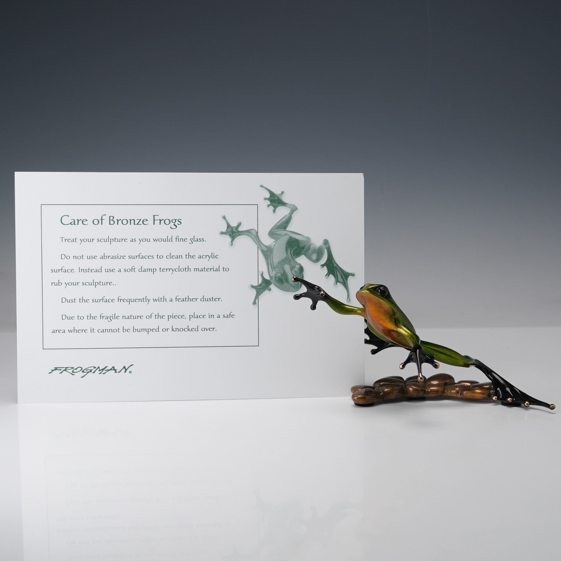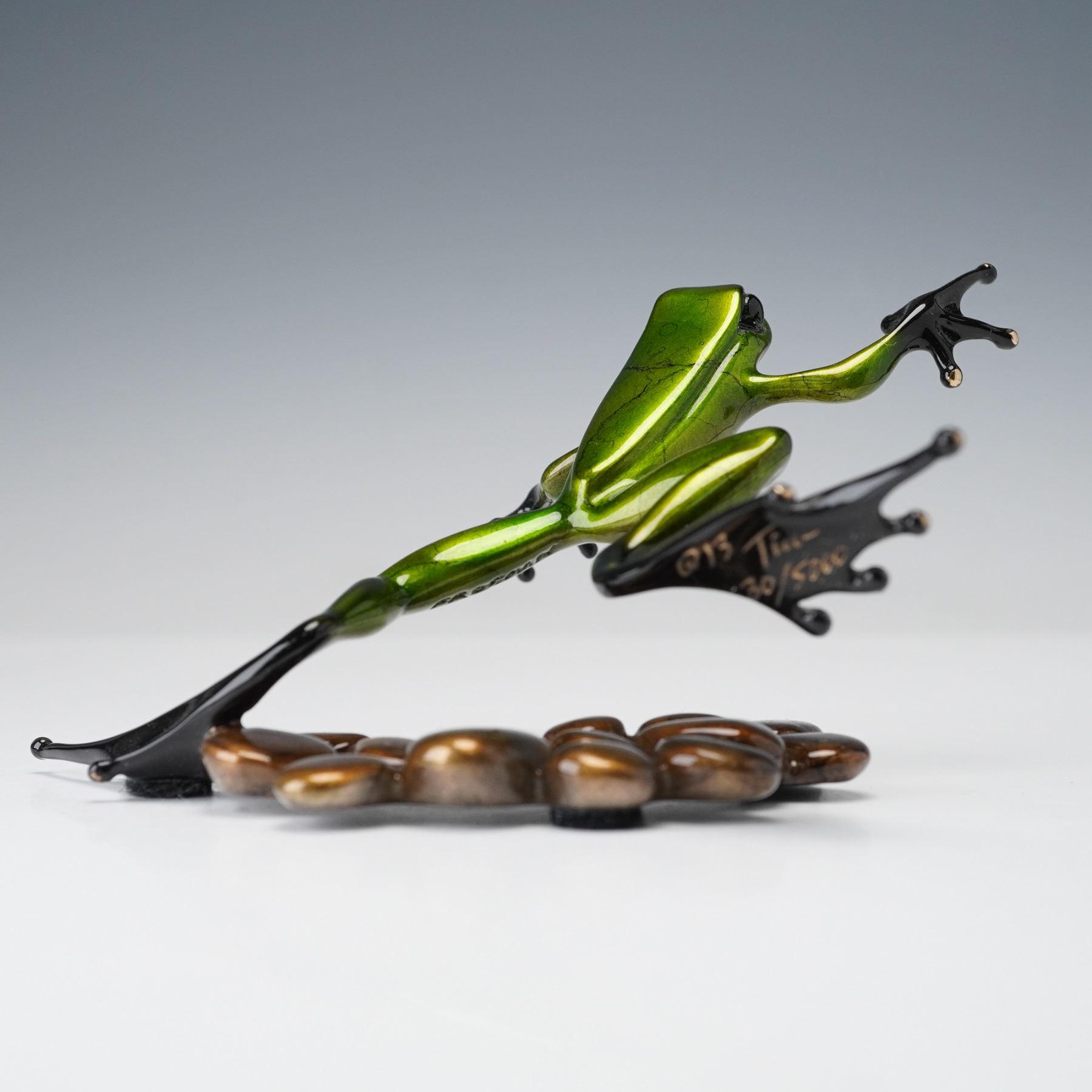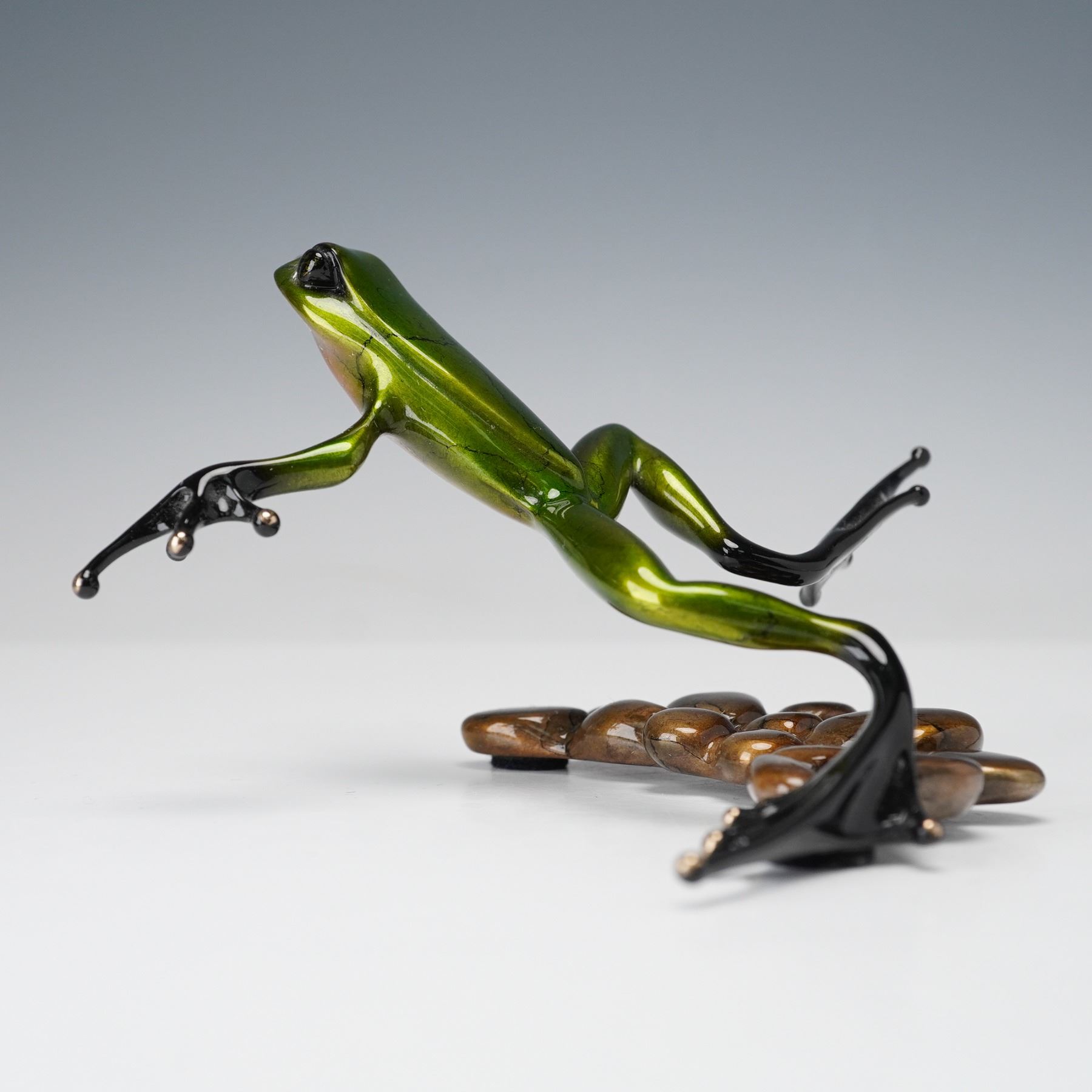 A striking bronze sculpture by Tim Cotterill, known as Frogman, titled Stepping Stone. The piece features a sleek, high-gloss green frog with black webbed feet, gracefully posed as if climbing across smooth bronze pebbles. The sculpture is finished with a lustrous patina that highlights the artist's signature fluid style and attention to form. Signed Frogman to the underside and accompanied by the original care card.