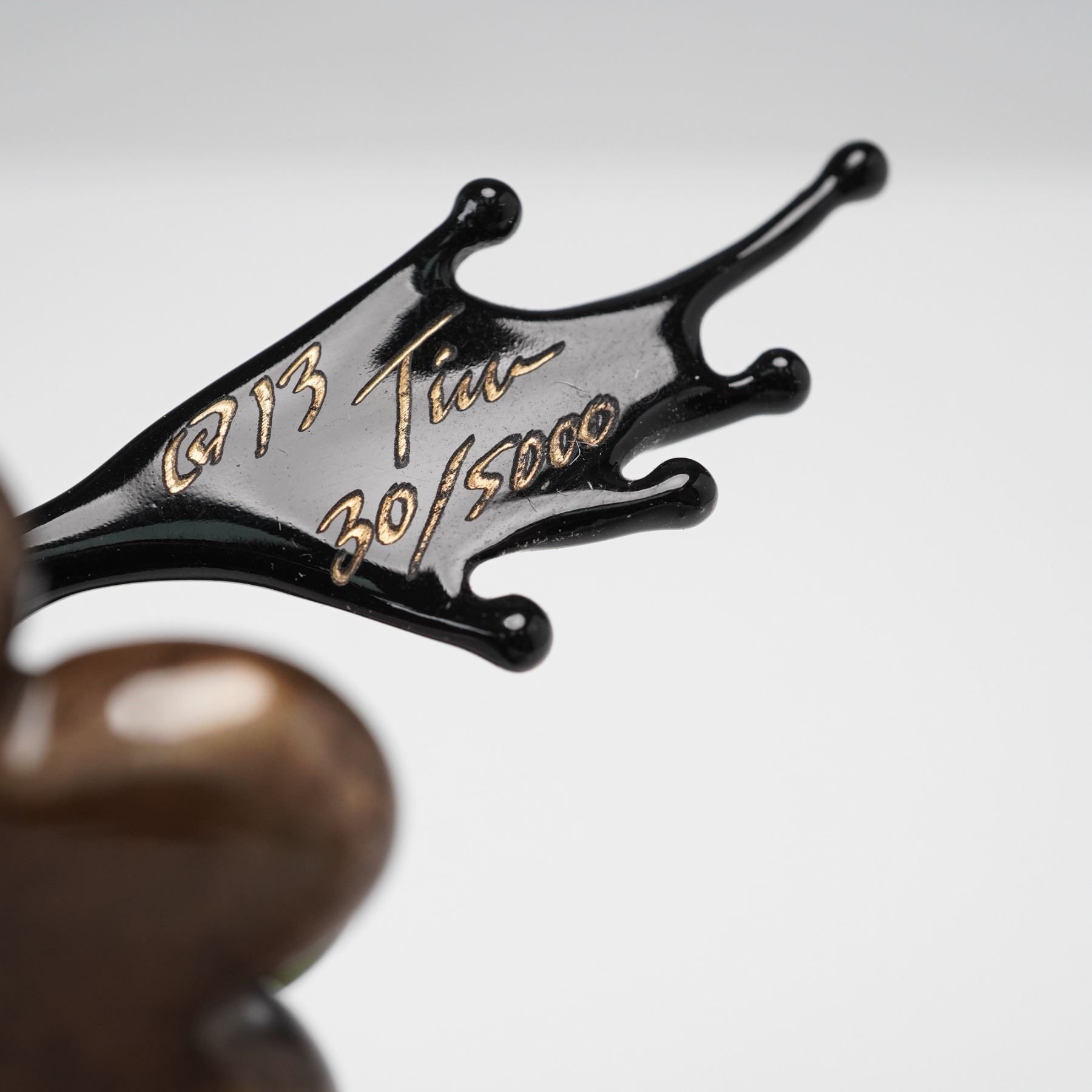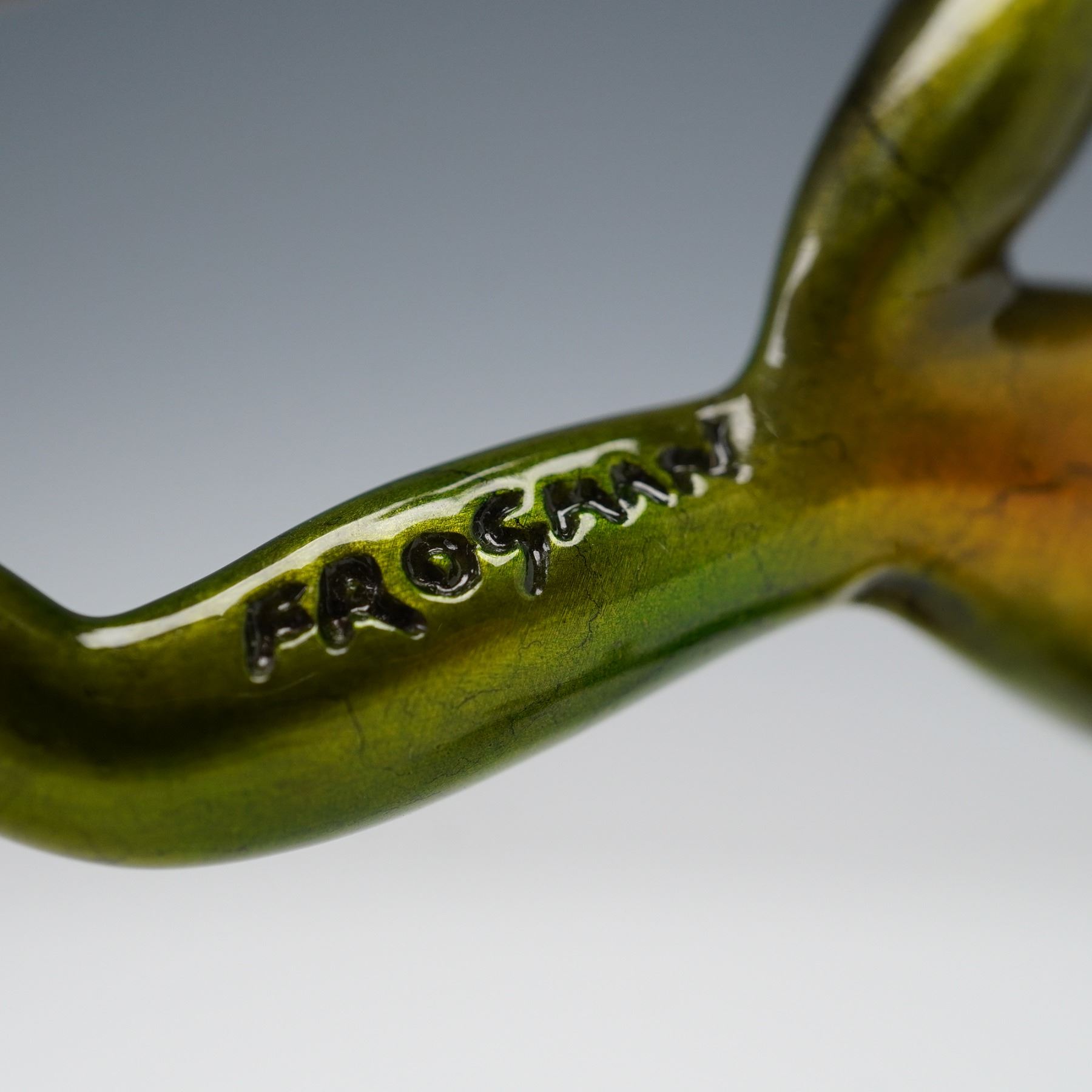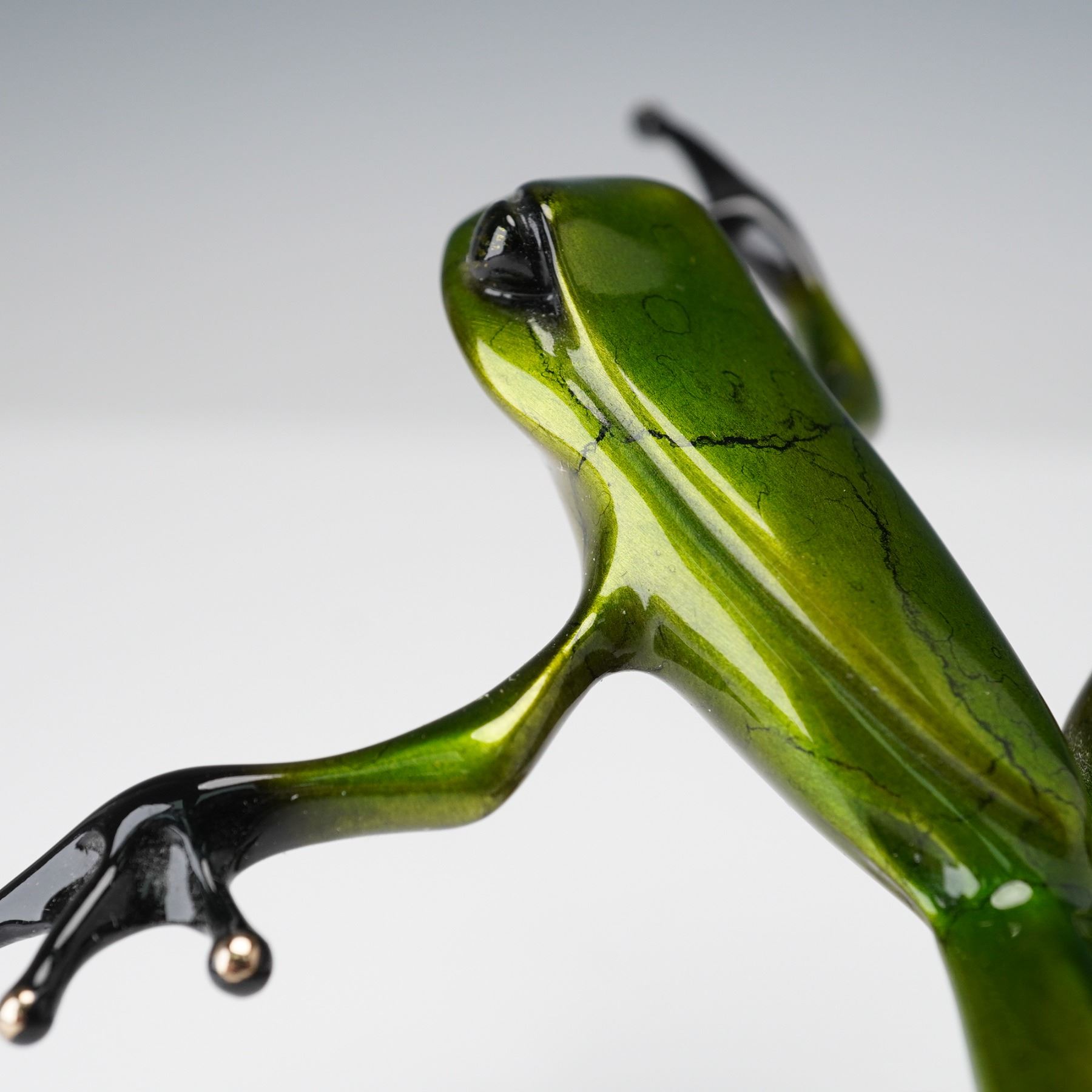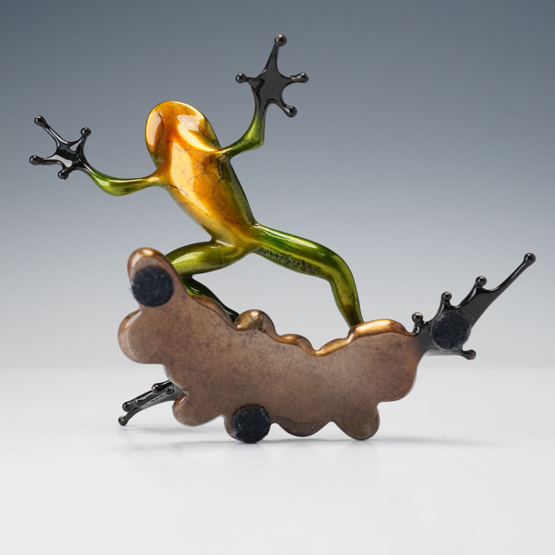 A striking bronze sculpture by Tim Cotterill, known as Frogman, titled Stepping Stone. The piece features a sleek, high-gloss green frog with black webbed feet, gracefully posed as if climbing across smooth bronze pebbles. The sculpture is finished with a lustrous patina that highlights the artist's signature fluid style and attention to form. Signed Frogman to the underside and accompanied by the original care card.