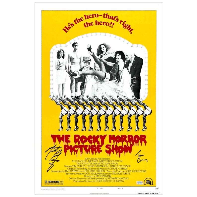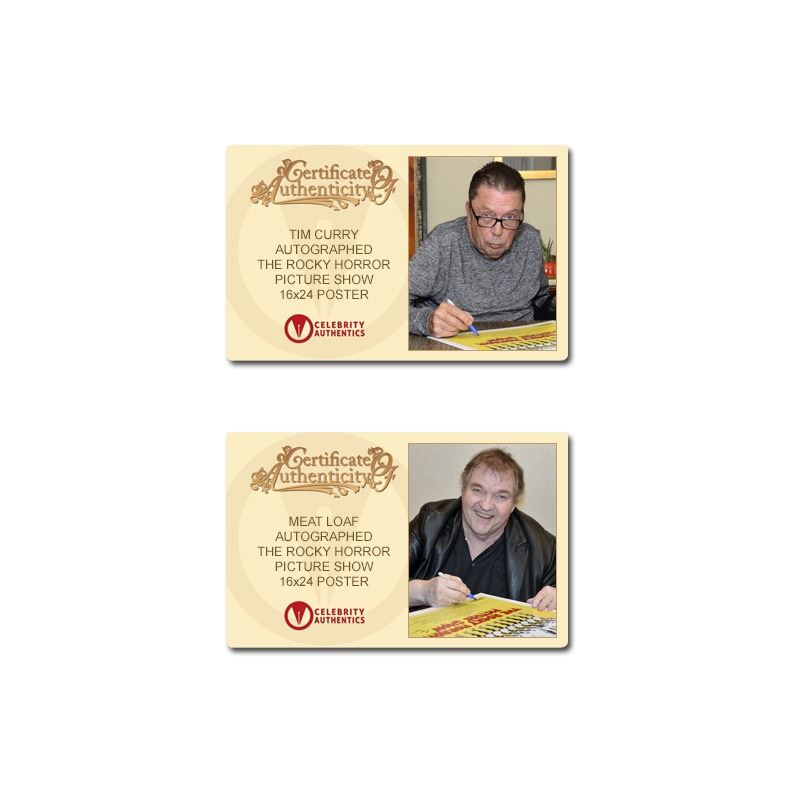 This fantastic 16x24 poster from The Rocky Horror Picture Show has been personally hand-signed by Tim Curry and Meat Loaf during their signings with Celebrity Authentics. Poster ships affixed with Celebrity Authentics serial-numbered and tamper evident Authentication Hologram and includes Celebrity Authentics Certificates of Authenticity featuring picture of Tim and Meat Loaf signing. Stock image used for product images. Item ships with clean, unsmudged autograph in similar location.