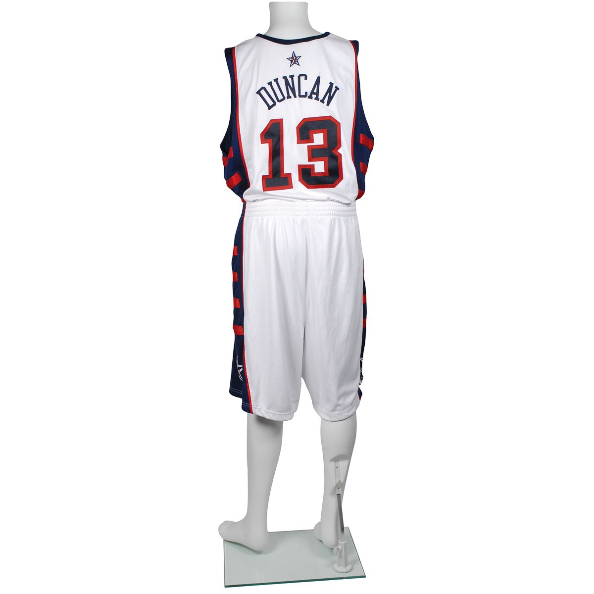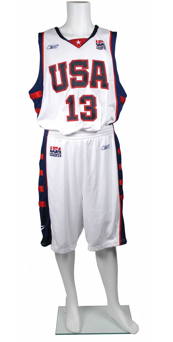 Duncan’s game-used red, white, and blue Reebok Team USA basketball uniform from the 2004 Olympic Games, consisting of both his jersey and shorts. Jersey features “USA” on the front, his number “13” on the front and back, and “Duncan” across the back. Left breast also bears the official USA Basketball logo patch. The proper Reebok USA Basketball tag is sewn to the lower left front tail, with flag tags indicating the size, “52,” alteration, “+4 Length,” and year, “2004.” Matching shorts feature a USA Basketball logo patch sewn to the right thigh and patriotic stars on both sides. The proper Reebok tag is sewn into the inner waistband, with flag tags indicating the size, “42,” alterations, “+2 Rise” and “+2 Inseam,” and year, “2004.” In fine condition. Accompanied by a letter of provenance from Brian Hargrove, in full: “I hereby confirm this Tim Duncan Team USA White Home uniform to be authentic and worn during the 2004 Olympic Games. I am employed as Equipment manager with Team USA Basketball and this uniform was in my possession from the time it was last worn.” Duncan served as Team USA’s captain, averaging 12.9 points and 9.1 rebounds per game throughout the Olympic tournament. Despite a loss to Argentina in the semifinals, Duncan and the American squad were victorious in the bronze medal match-up against Lithuania. Complete game-used uniforms are rather scarce and, as one of the greatest players in NBA history, Duncan’s is an especially desirable piece.