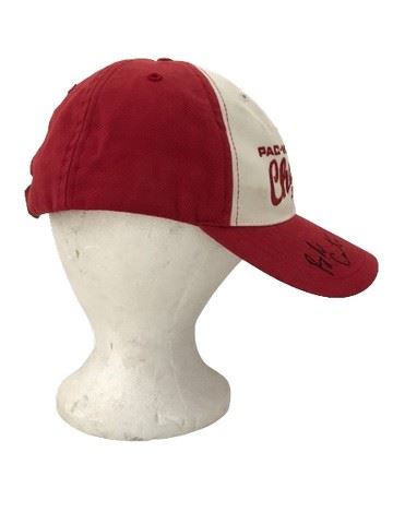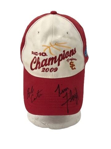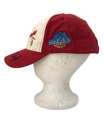 USC Pac 10 Champions, red, white and gold, officially licensed collegiate products baseball cap dated 2009. "Trojans SC” on front of crown and “Pacific Life Pac-10 Tournament” embroidered on left side of crown on a blue and orange basketball.