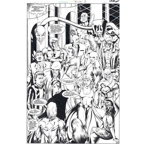 <B>Tim Hamilton and Romeo Tanghal - Justice League Europe Annual #3, Splash page 30 Original Art (DC, 1992).</B></I> There are more Justice Leaguers in this room than you can shake a stick at! Captain Atom, Elongated Man, Metamorpho, Power Girl, Flash III, Ice Maiden, Green Flame, Animal Man, Mister Miracle, Blue Beetle, the Martian Manhunter, and Booster Gold top off this stellar collection of heroes, penciled by Tim Hamilton, and inked by Romeo Tanghal. The image area measures 10" x 15", and, aside from some light overall aging, and a top edge trimmed during the production process, the condition is Excellent.