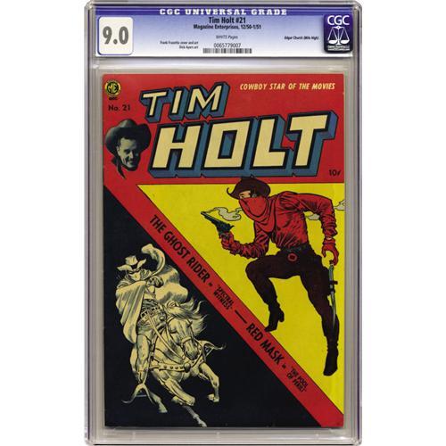 <B>Tim Holt #21 Mile High pedigree (Magazine Enterprises, 1951) CGC VF/NM 9.0 White pages.</B></I> Frank Frazetta and Edgar Church are two names associated with excellence! Frazetta drew this issue's cover and Church preserved this copy in his famed high-grade collection. The stars of the issue are Red Mask and Ghost Rider, the latter drawn by Dick Ayers. Overstreet 2006 VF/NM 9.0 value = $348; NM- 9.2 value = $465. CGC census 5/06: 2 in 9.0, none higher. <BR><BR><B>Important notice:</B> Heritage usually auctions material at the rate of 200-250 lots per hour. On some occasions eBay Live bid software or the Internet may not be able to keep up with the pace of the auction. We recommend placing a realistic absentee bid now as insurance to avoid disappointment. Occasionally the auctioneer may eliminate or reject an eBay Live bid, and the auctioneer may also reopen a lot after the close of the eBay live bidding (usually because we missed an audience bid), and may reject your bid even if it shows you as the winning bidder. By bidding via eBay Live, you agree that Heritage may award the lot to another bidder at its sole discretion under the circumstances described above or any other reasonable circumstances. Since eBay bids are not shown to us until we open the lot on the floor, we treat those bids just like floor bids. In most cases the floor responds before the eBay bid is presented to us, due to Internet lag time, so for consistency we have made it a policy that floor bids are always considered first over tie eBay live bids. Also please note that all Heritage lots purchased through eBay Live carry a 22.5% Buyer's Premium. Please make sure you read the Terms and Conditions before you bid. This lot is being auctioned in conjunction with a live floor auction by Heritage Auction Galleries. All final auction and invoice information will be supplied by Heritage Auction Galleries, and all other information should be considered preliminary. Lot:41001 <BR><BR><B>Winning Notification and Billing:</B> After the FINAL session in this auction is complete, Heritage will send e-mail and snail mail invoices. This process normally takes several days. All final auction and invoice information will be supplied by Heritage Auction Galleries, and all other information should be considered preliminary. <BR><BR>This auction will be conducted on a live auction floor and over the Internet through eBay Live. If you choose to place an absentee bid, please take a moment to <font color='#0000ff'><u><a href='http://pages.ebay.com/liveauctions/help/before/laabsentee.html'>learn how eBay Live absentee bidding works</a></u></font><font color='#000000'>