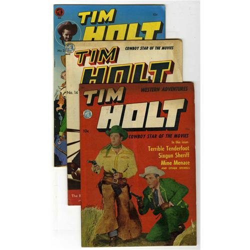 <B>Tim Holt Group - Davis Crippen ("D" Copy) pedigree (Magazine Enterprises, 1949-53) Condition: Average FN+.</B></I> Includes #9 (VG+, includes map of Tim's Home Range), 14 (FN-), 24, 28 (Wild Bill Hickok and Bat Masterson team up with Redmask), and 37 (classic Ghost Rider "To Touch is to Die!" story). Frank Bolle covers, Dick Ayers art. Approximate Overstreet value for group = $225. <I>From the Crippen Collection.</B></I><BR><BR><b>Shipping:</b> Comics - Unslabbed (<a target="_blank" href="http://www.heritageauctions.com/common/shipping.php">view shipping information</a>)