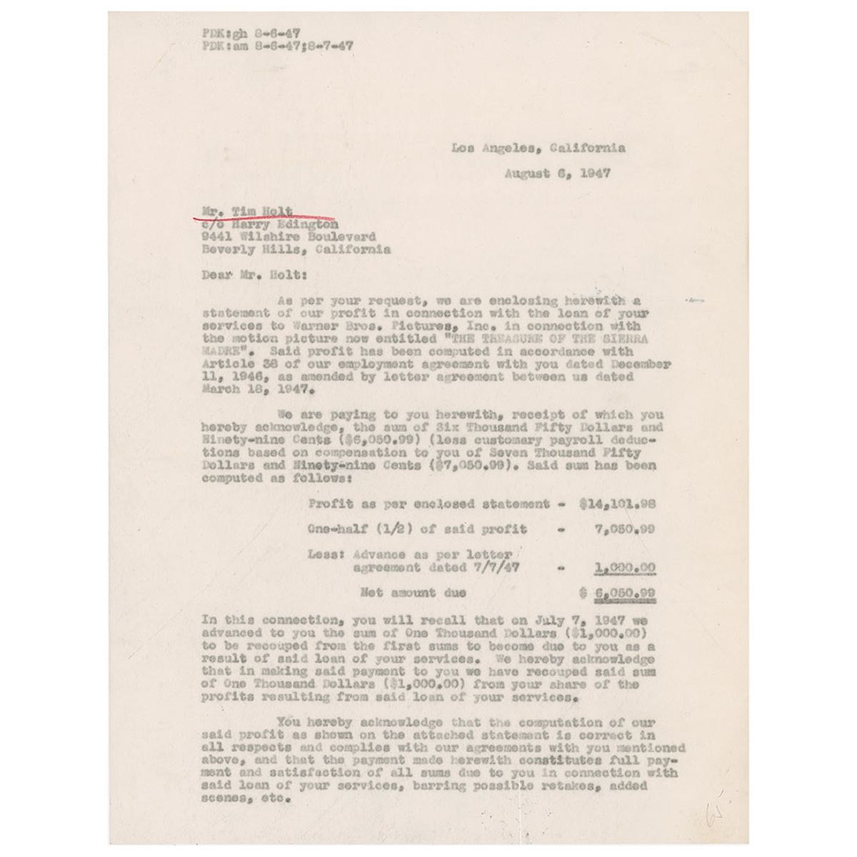 DS, two onionskin pages, 8.5 x 11, August 6, 1947. RKO Pictures encloses “a statement of our profit in connection with the loan of your services to Warner Bros. Pictures, Inc. in connection with the motion picture entitled ‘The Treasure of Sierra Madre’…We are paying to you herewith, receipt which you hereby acknowledge, the sum of Six thousand fifty dollars and Ninety-nine cents.” An included third page is the statement of profit. Signed on the second page in blue ink by Holt. In fine condition, with staple holes to top edge, and some light creasing and office stamp to third page.