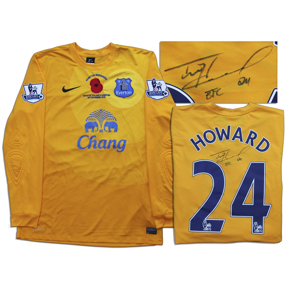 Tim Howard match worn soccer jersey signed. Shirt was worn during the Crystal Palace versus Everton game on 9 November 2013. Embroidered with a red poppy flower as part of the yearly Poppy Appeal campaign, which honors British Armed Forces and veterans. Near fine. With a COA from the Everton club. Provenance is from a charity auction benefiting The Royal British Legion, which provides support to the armed forces and their families.