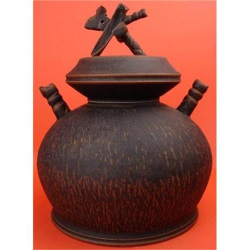 Adorning the top of Tim Mathers' imaginative vessel is an extraordinary sculpture by the renowned Marilee Hall. A striking and unforgettable collaboration from 1984 between two great ceramic artists. An early piece like this is especially valuable, as Mathers is now the head of the Ceramic Department at Indiana University, and is no longer producing any work. This piece has had a single owner since it was created over 20 years ago. Height: 10 inches (25.5 cm), Circumference: 27 inches (68.5 cm)