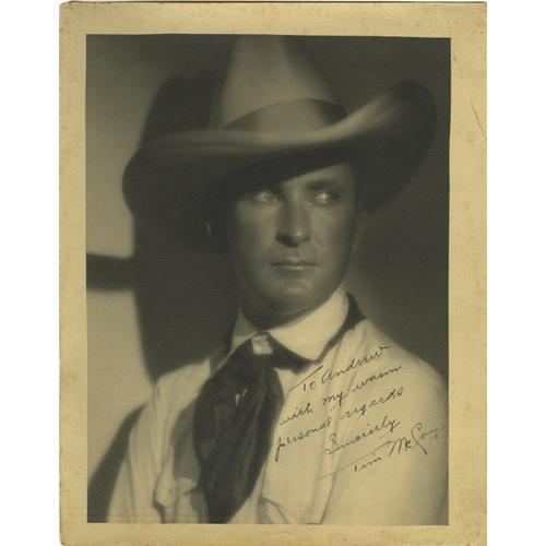 <B>Tim McCoy Autographed Picture.</B></I> An outstanding 11" x 14" inscribed and signed matte finish portrait of legendary cowboy star Tim McCoy (1891-1978). Besides his stardom, McCoy was notable for his World War I service and the respect he enjoyed from the Indian community. "Please Credit Ruth Harriet Louise Metro-Goldwyn-Mayer Photographer" is stamped on the verso, and her name embossed on the lower border. Some border staining and a crease on the upper right borer - otherwise Very Fine + condition.<BR><BR><b>Shipping:</b> Flat Material, Small (<a target="_blank" href="http://www.heritageauctions.com/common/shipping.php">view shipping information</a>) <BR><BR><B>Important notice:</
