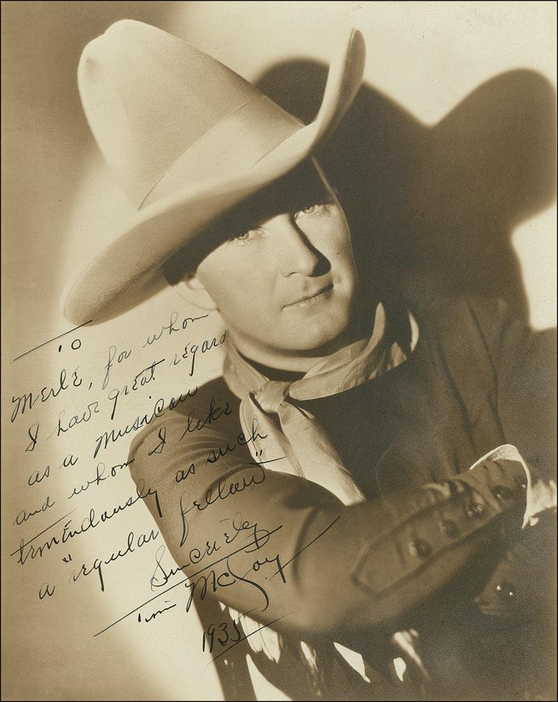 Vintage sepia matte-finish 7.5 x 9.5 photo of McCoy if full western gear, signed and inscribed in fountain pen “To Merle, for whom I have great regard as a musician and whom I like tremendously as such a ‘regular’ fellow. Sincerely, Tim McCoy 1935.” In fine condition, with lightly trimmed edges, a couple surface creases, and scattered silvering to darker areas. Pre-certified PSA/DNA and RRAuction COA.