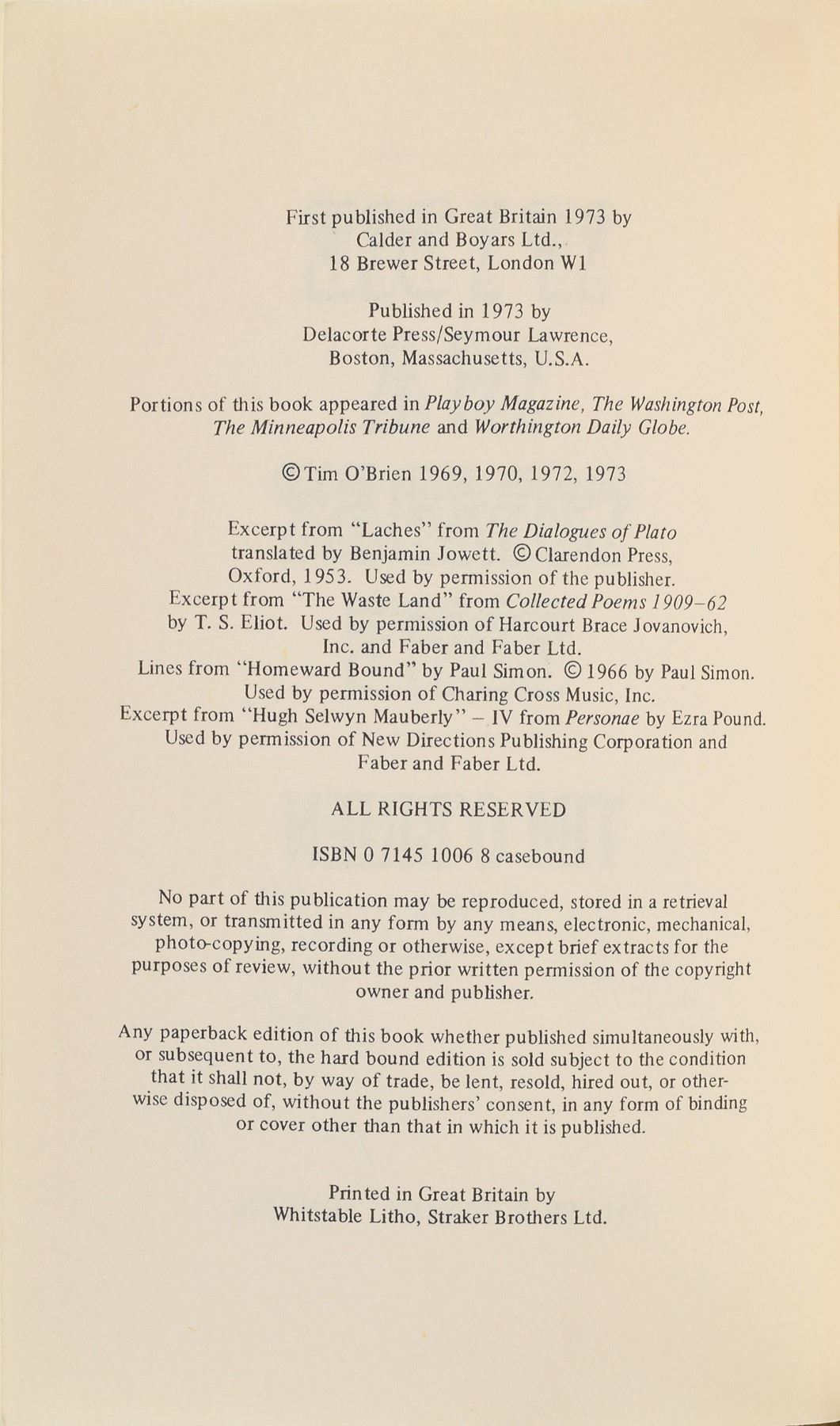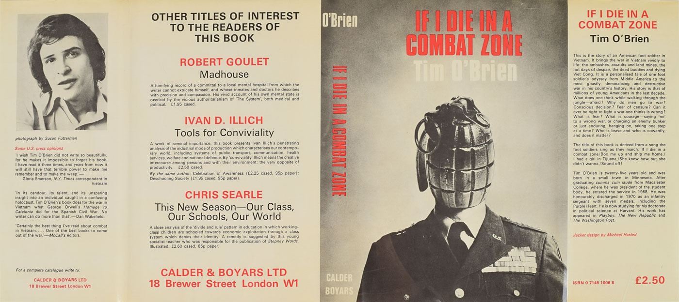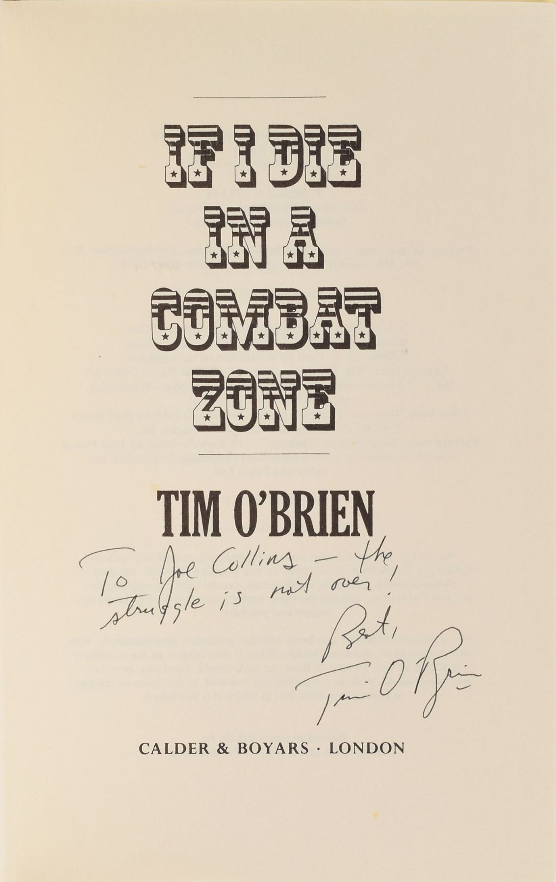 Signed book: If I Die in a Combat Zone. First British edition. London: Calder & Boyars, 1973. Hardcover with dust jacket, 5.5 x 8, 199 pages. Signed and inscribed on the title page in black felt tip, "To Joe Collins—the struggle is not over! Best, Tim O'Brien." Autographic condition: fine. Book condition: VG+/VG+.