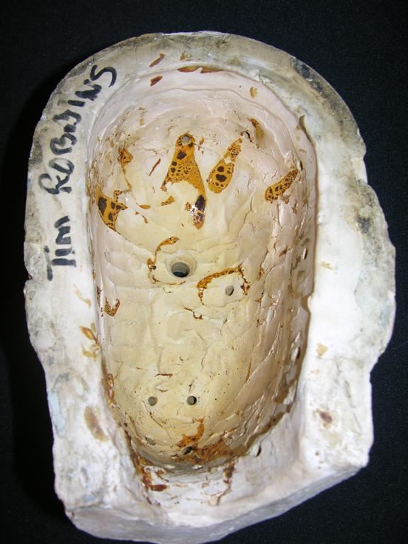 From the hands of legendary special effects make-up wizards Thomas & Bari Burman of the award winning Burman Studios, this is a Lifecast of Oscar winning actor Tim Robbins, used for special prosthetic make-up appliances in several of his motion picture roles. The use of "plug holes" show that these were used for specific appliances of the nose, chin and forehead. Created directly from a cast of Robbin's actual face. Made at Burman Studios. (Approx 11"x8"x7").