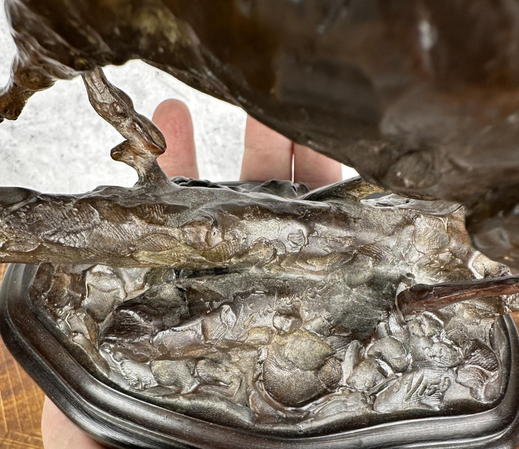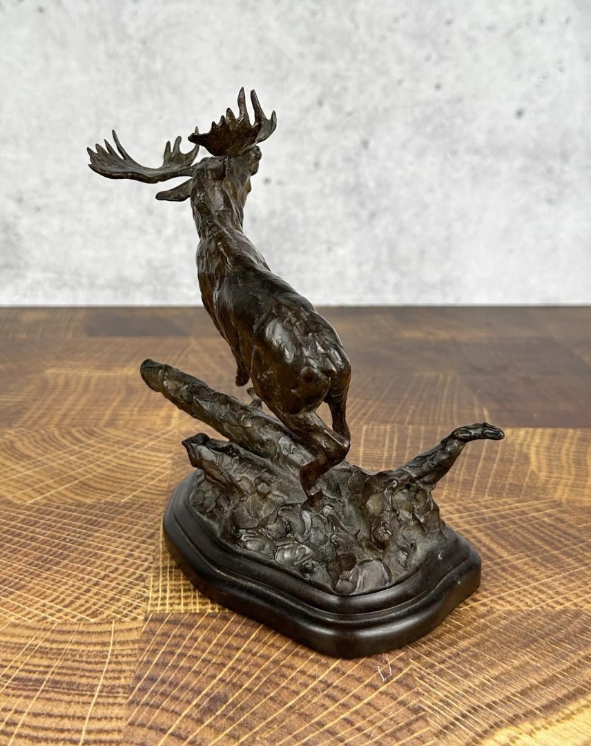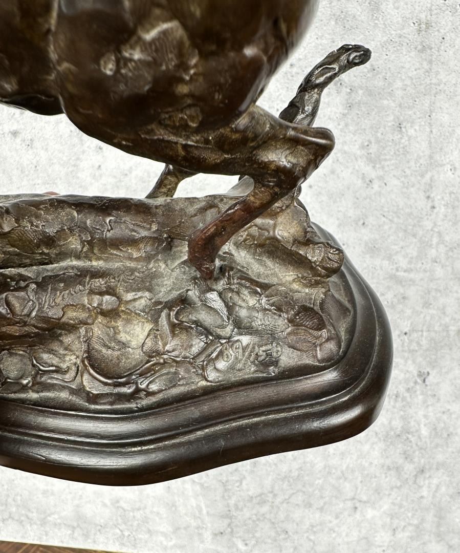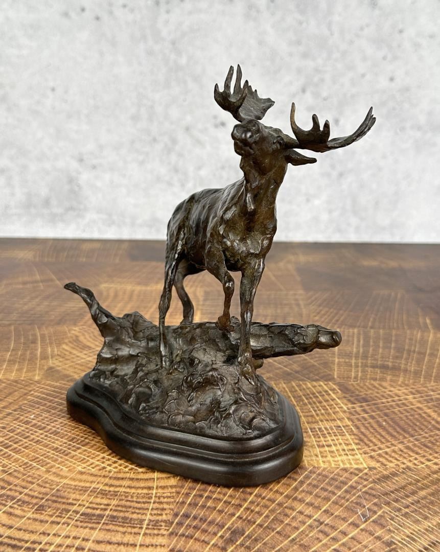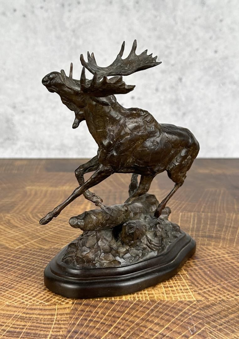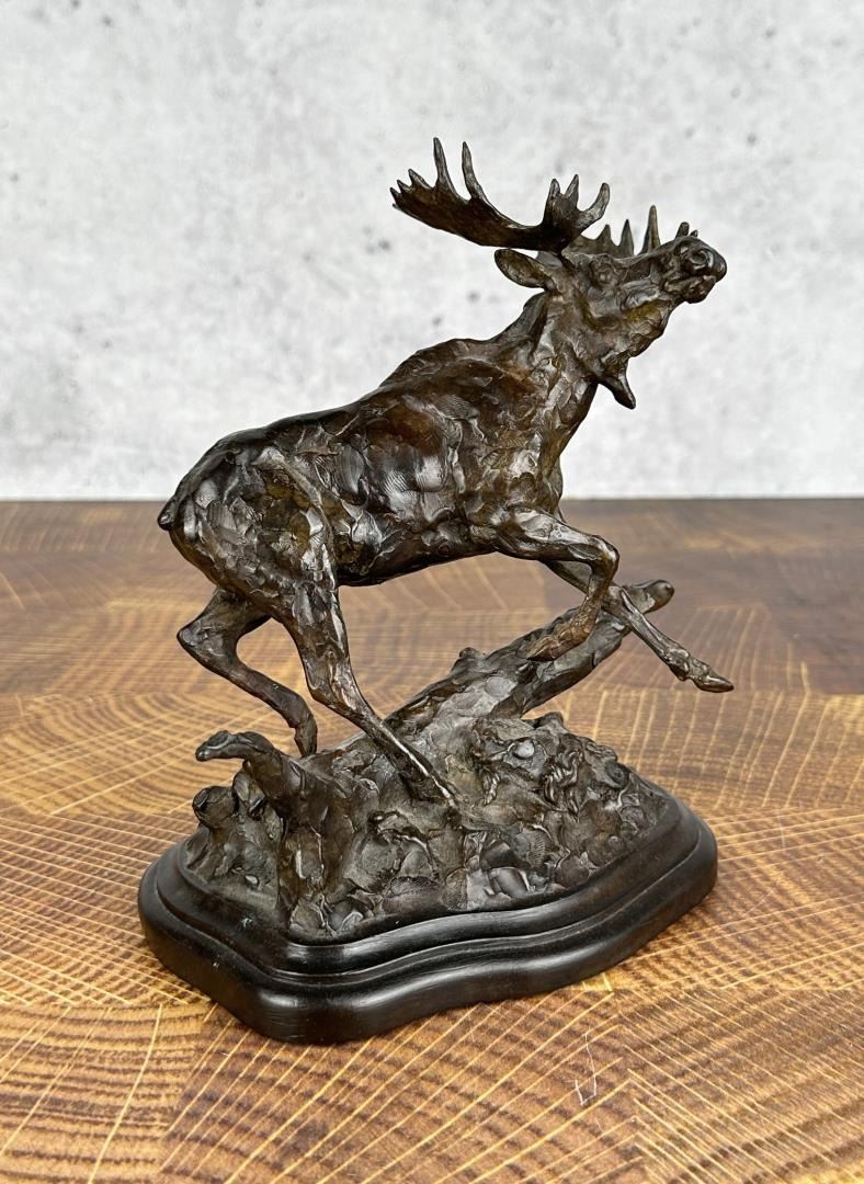 Title is Through the Jungle. 7 1/2" by 6 3/8" by 4 1/8". Tim Shinabarger (Born 1966) is active/lives in Montana. Tim Shinabarger is known for Wildlife-landscape, western genre. Sculptor and avid outdoorsman, Tim Shinabarger, began sculpting as a diversion while recuperating from a snowmobile accident on the Boulder River. Shinabarger also began to paint and was influenced by the work of wildlife artist Carl Rungius. His jobs after college, as a ranger in the Custer National Forest, a firefighter in Yellowstone and as a guide and packer with the North Yellowstone Outfitters gave the artist plenty of material for his art. The artist continues to be an avid backpacker often taking trips with his wife to unspoiled areas in the western United States. In 2001 the couple traveled above the Arctic Circle to the Kongakut River in the Alaskan Wildlife Refuge.