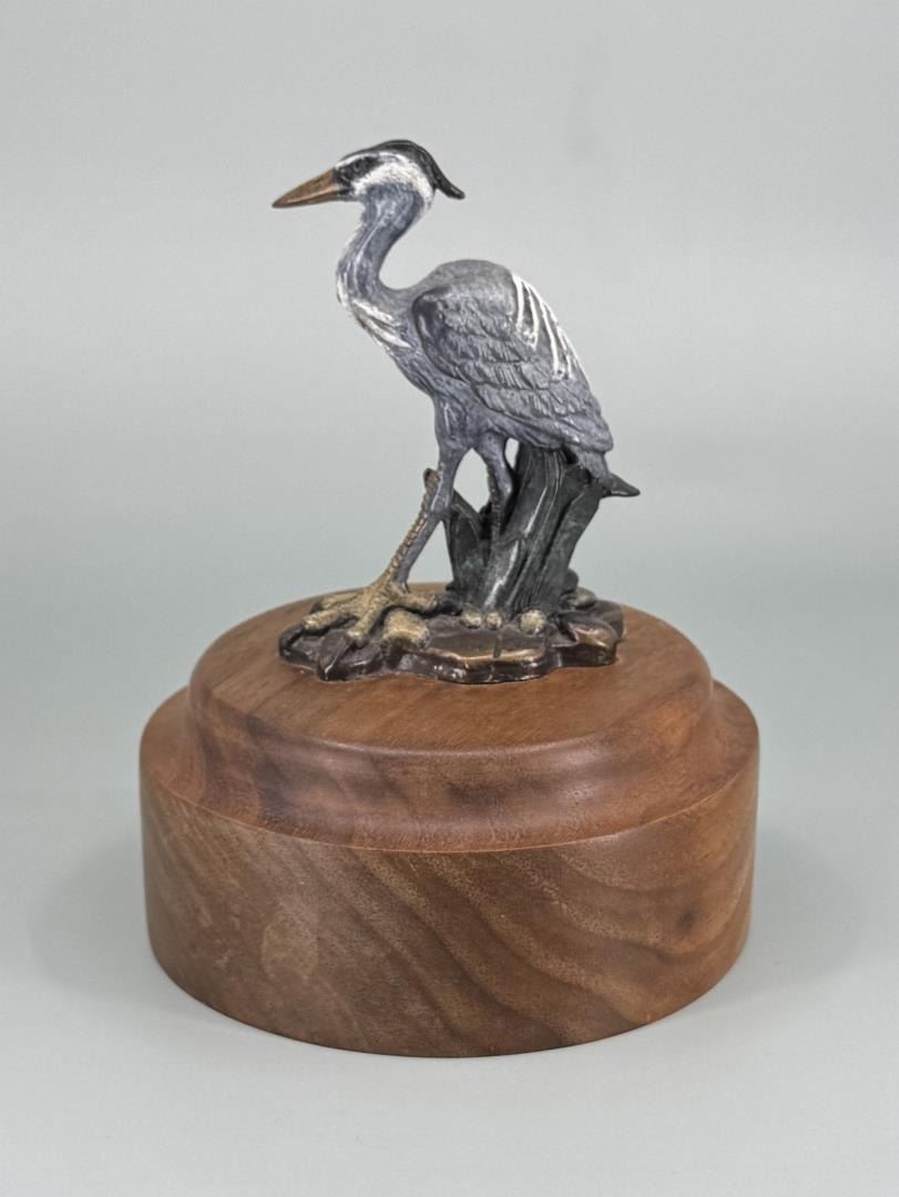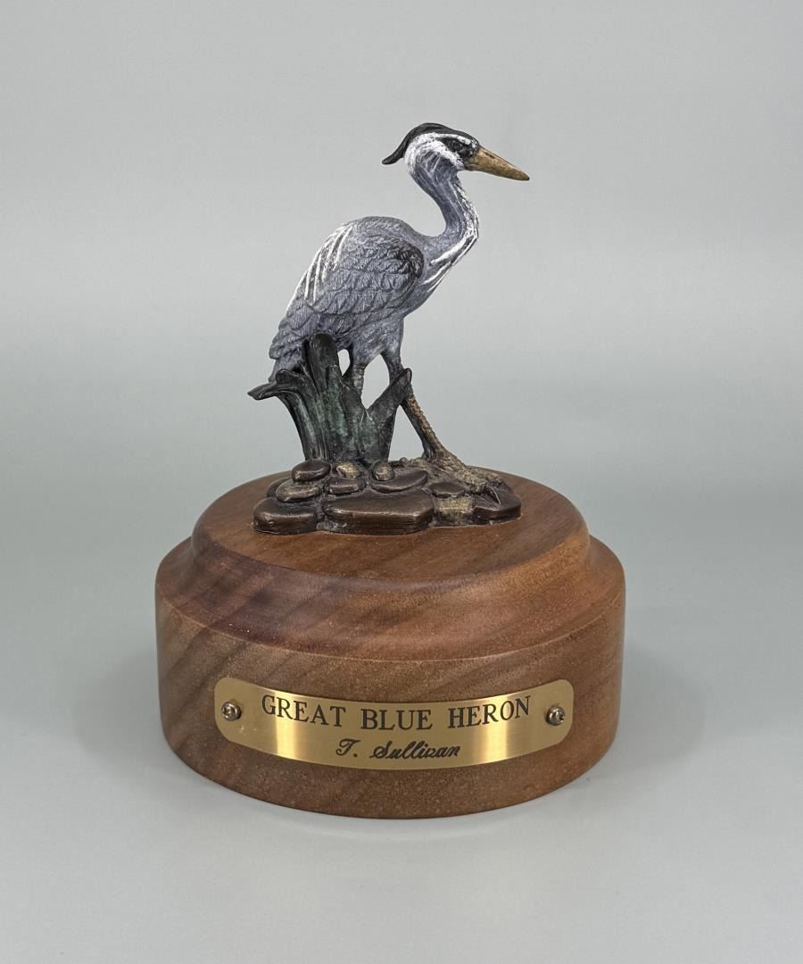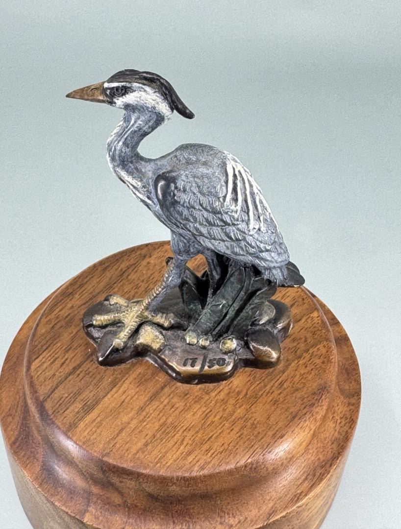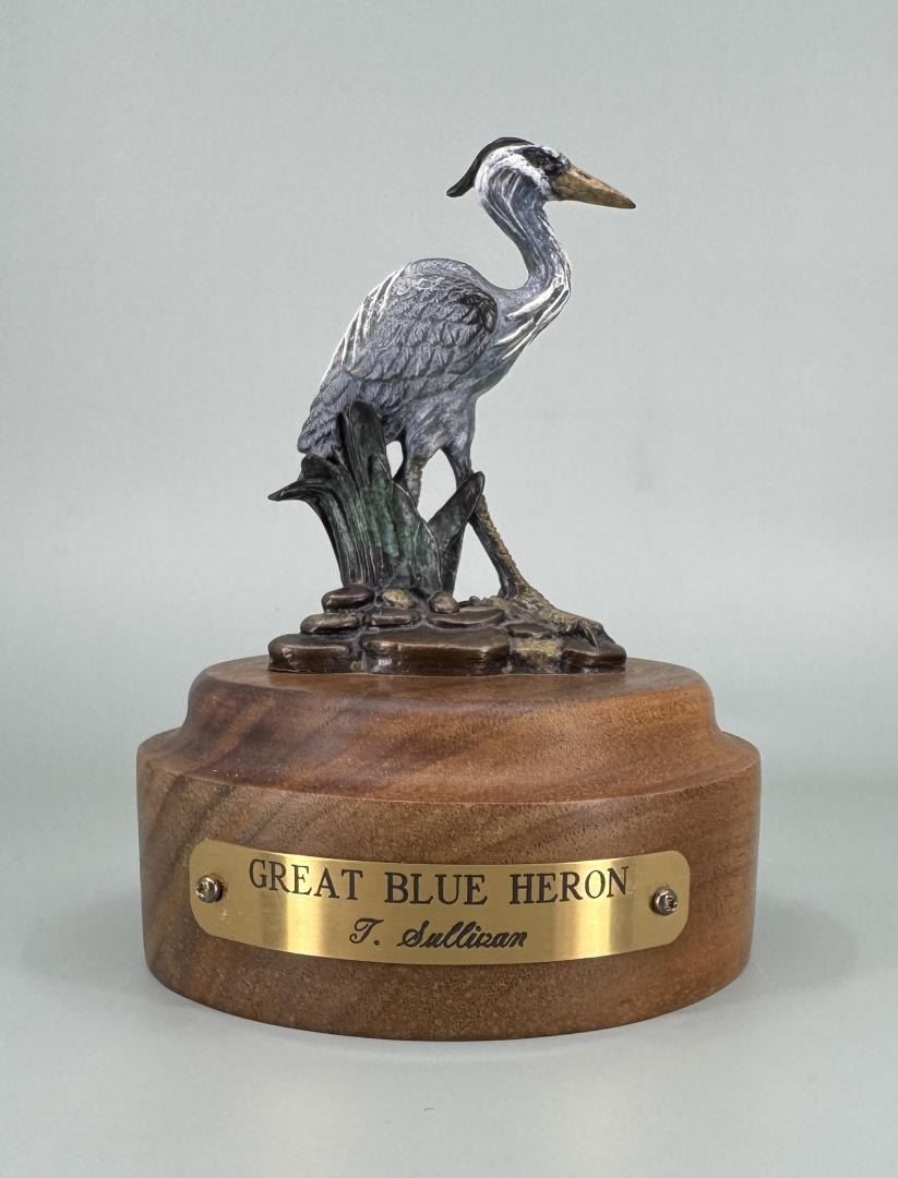 Title is Great Blue Heron. 4 7/8" by 3 7/8" by 3 7/8". Tim Sullivan (Born 1949) is active/lives in Montana. Tim Sullivan is known for Sculptor-western figure/wildlife.
