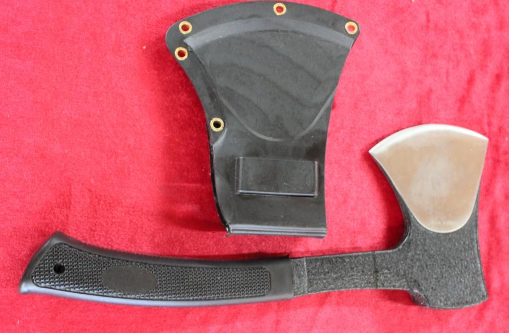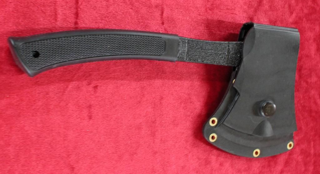 Stainless Steel Blade, Black Molded Handle, ABS Sheath. 3.5" Axe Head, 10 3/8" Overall