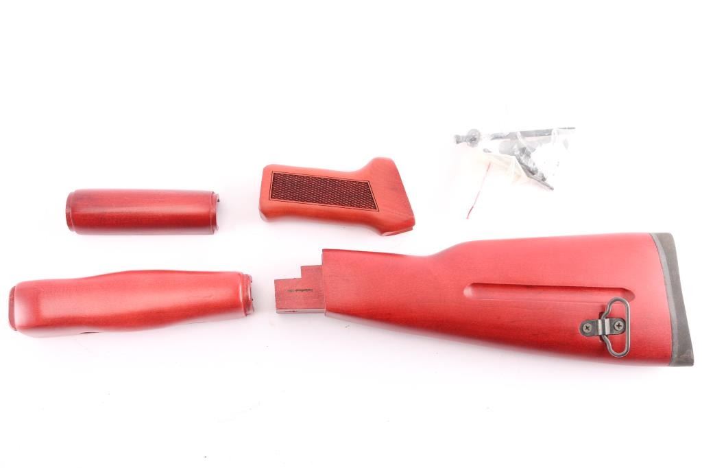 TimberSmith Premium Red Laminate Romanian AK-47 Stock Set. Standard set upgraded with a precision fit recoil absorbing rubber buttpad, a checkered patterned pistol grip, and a lightening cut on the stock and handguard. Colored in the highly sought after Russian Red, on laminate. Made in the U.S. New in box with paperwork, screws, plates and drill bit.