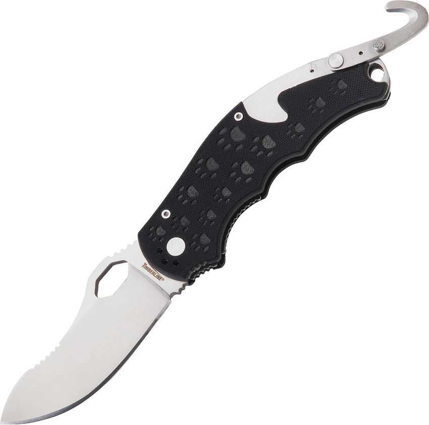 4 5/8" closed linerlock. 3 1/2" D2 tool steel skinner blade with thumb slot. 1 5/8" stainless guthook blade opens from back of knife. Textured black G10 handles with green spotted pattern. Reversible stainless pocket clip. Tim Wegner design