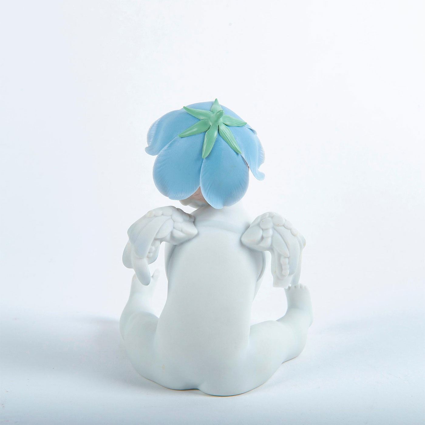 Matte white porcelain modeled as a fairy wearing a light blue floral petal hat.