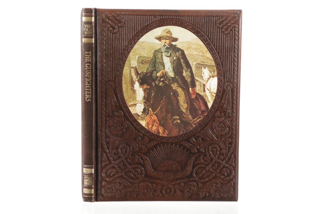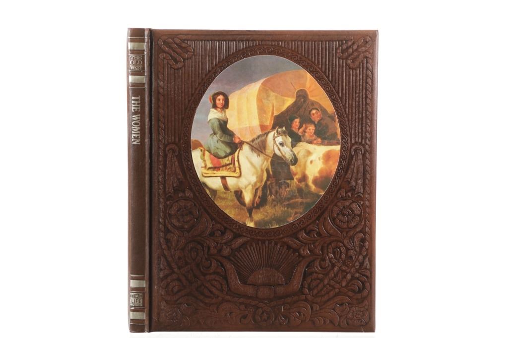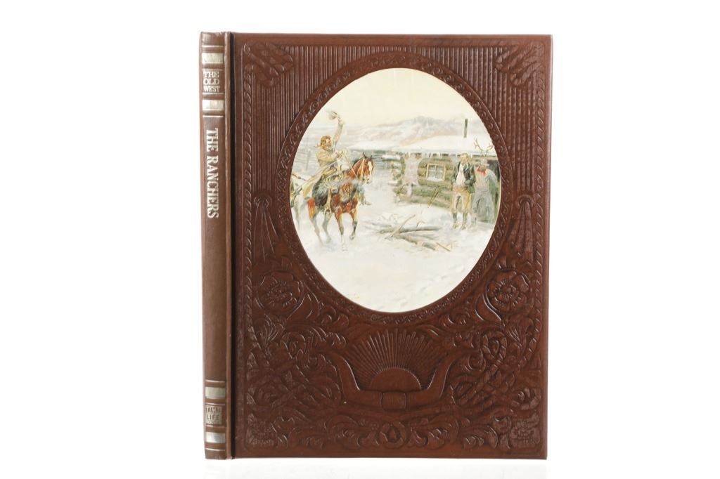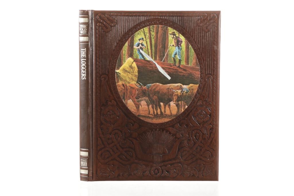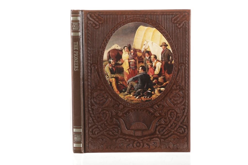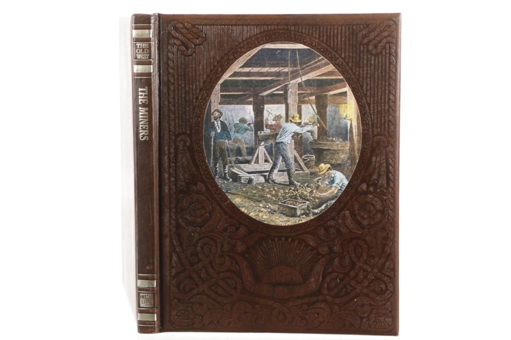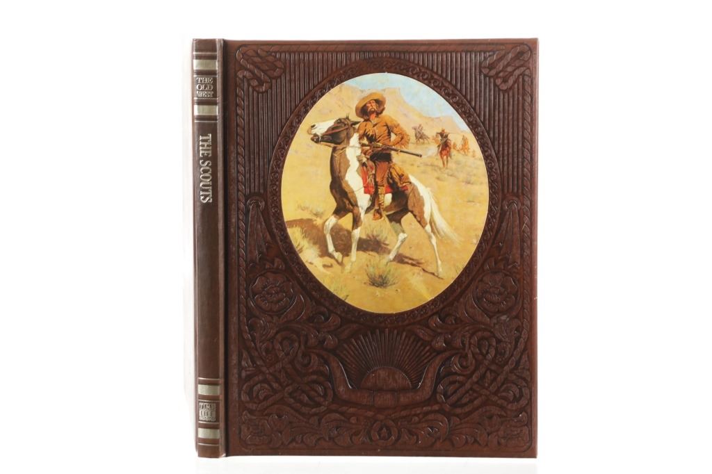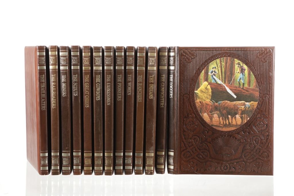 The Old West series tells the history of the American Old West era, focusing on different topics in each book such as the cowboys, Native Americans, soldiers, railroaders, women, gunfighters and many more. Each volume in the series is 240 pages long and includes numerous contemporary images and graphics. Titles include: "Loggers", "Gunfighters", "Indians", Ranchers", Women", "Pioneers", "Expressmen", "Cowboys", "Great Chiefs", "Scouts", "Miners", "Railroaders", and, "Trailblazers". They are bound in a padded faux leather hardcover binding with the series name, book title, and publisher printed in gold gilt on the spine. The front cover of the book features a glued-on oval-shaped image. A set of bull horns with a rising sun between the horns sits beneath the picture embossed in the faux leather, while the cover's outline is embossed with a rustic rope. The books show good condition overall with slight wear present from their age and use over the years, but no signs of obvious damage is noted. They each measure 11" L x 8 5/8" W x 7/8" D and have a collective weight of 27lb, 4oz
