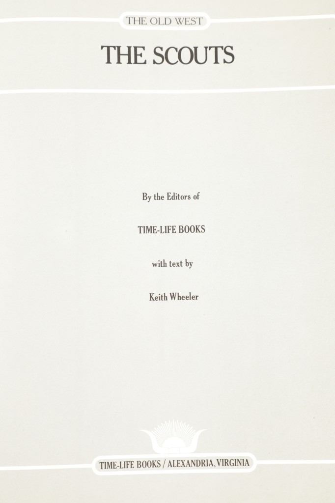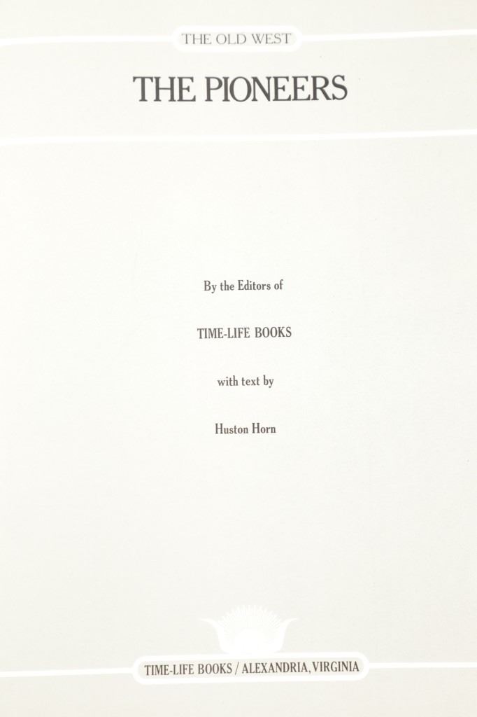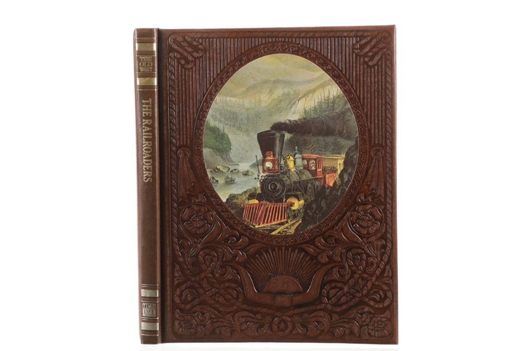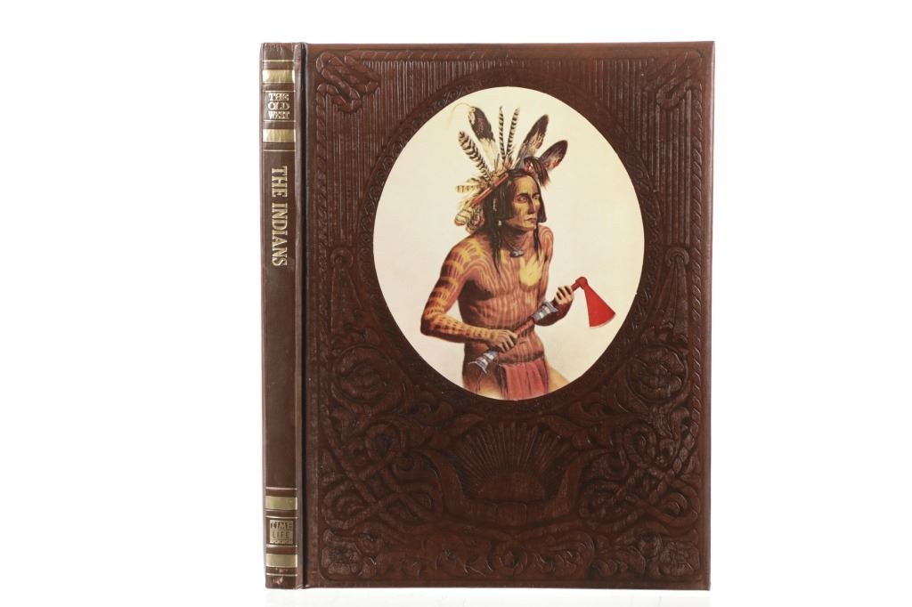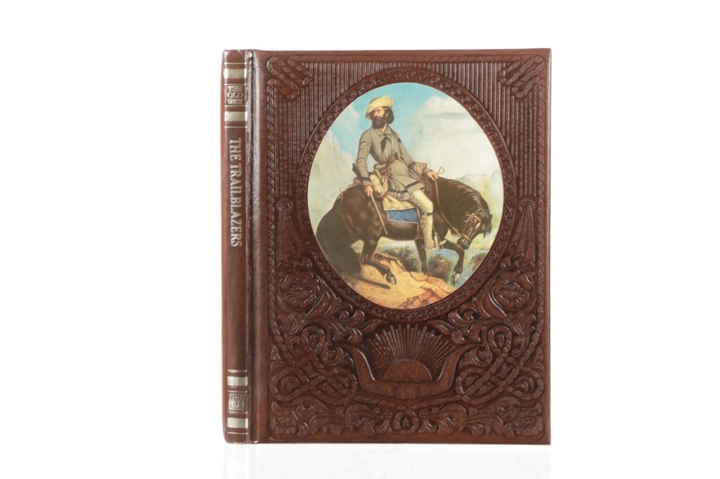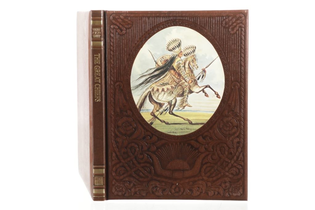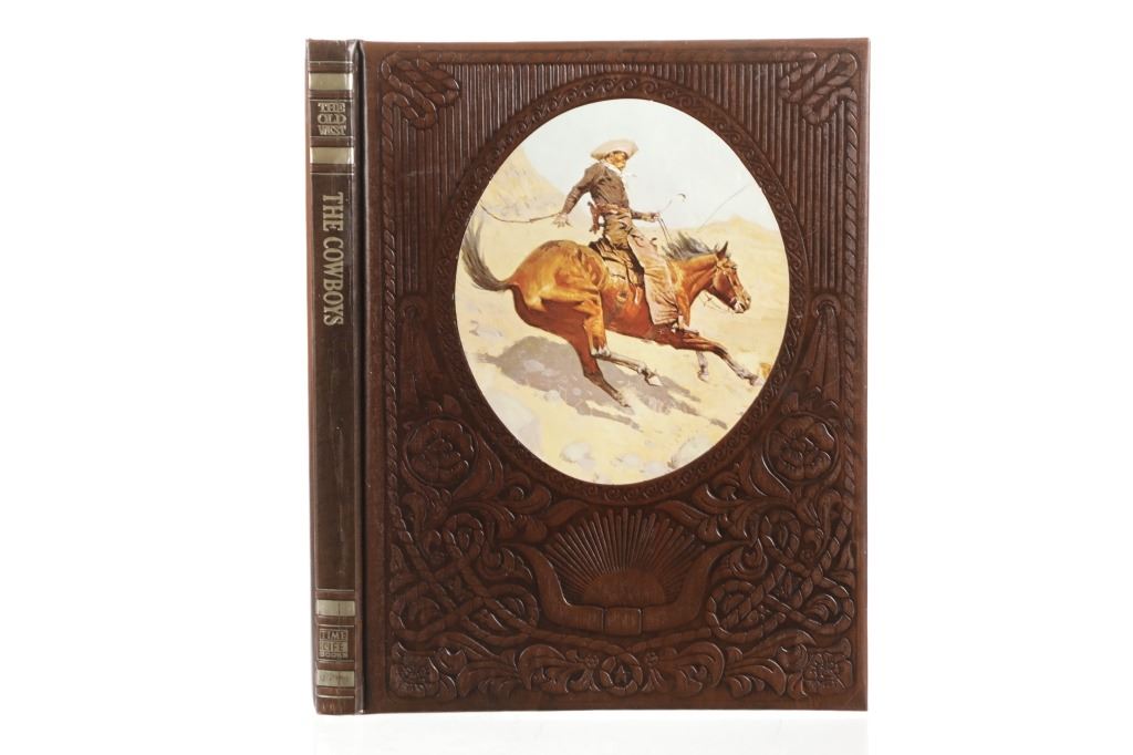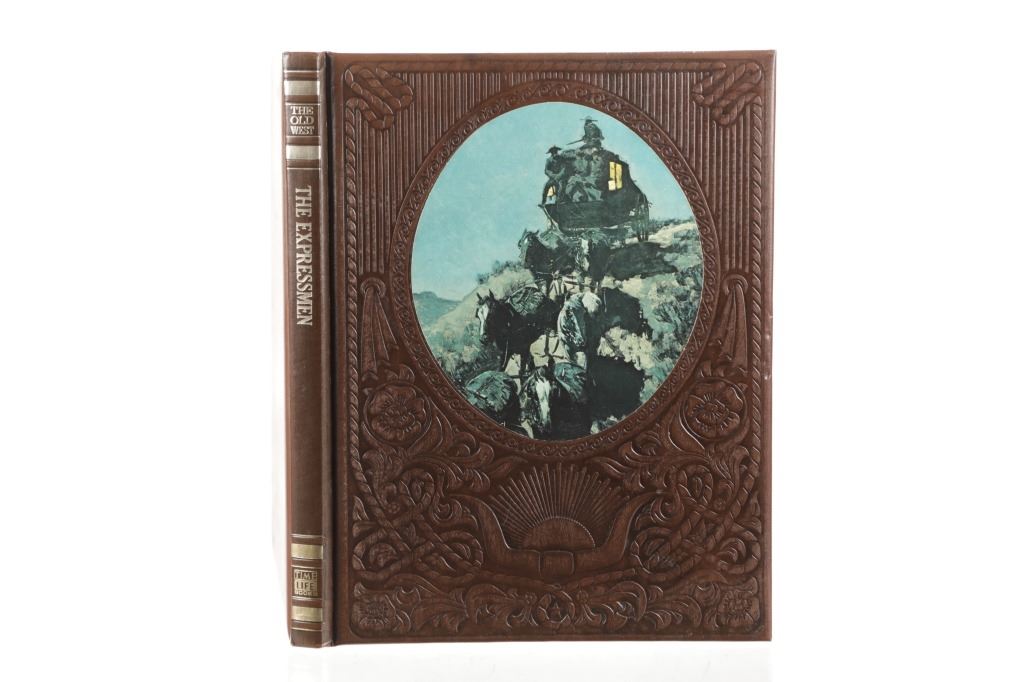 The Old West series tells the history of the American Old West era, focusing on different topics in each book such as the cowboys, Native Americans, soldiers, railroaders, women, gunfighters and many more. Each volume in the series is 240 pages long and includes numerous contemporary images and graphics. Titles include: "Loggers", "Gunfighters", "Indians", Ranchers", Women", "Pioneers", "Expressmen", "Cowboys", "Great Chiefs", "Scouts", "Miners", "Railroaders", and, "Trailblazers". They are bound in a padded faux leather hardcover binding with the series name, book title, and publisher printed in gold gilt on the spine. The front cover of the book features a glued-on oval-shaped image. A set of bull horns with a rising sun between the horns sits beneath the picture embossed in the faux leather, while the cover's outline is embossed with a rustic rope. The books show good condition overall with slight wear present from their age and use over the years, but no signs of obvious damage is noted. They each measure 11" L x 8 5/8" W x 7/8" D and have a collective weight of 27lb, 4oz