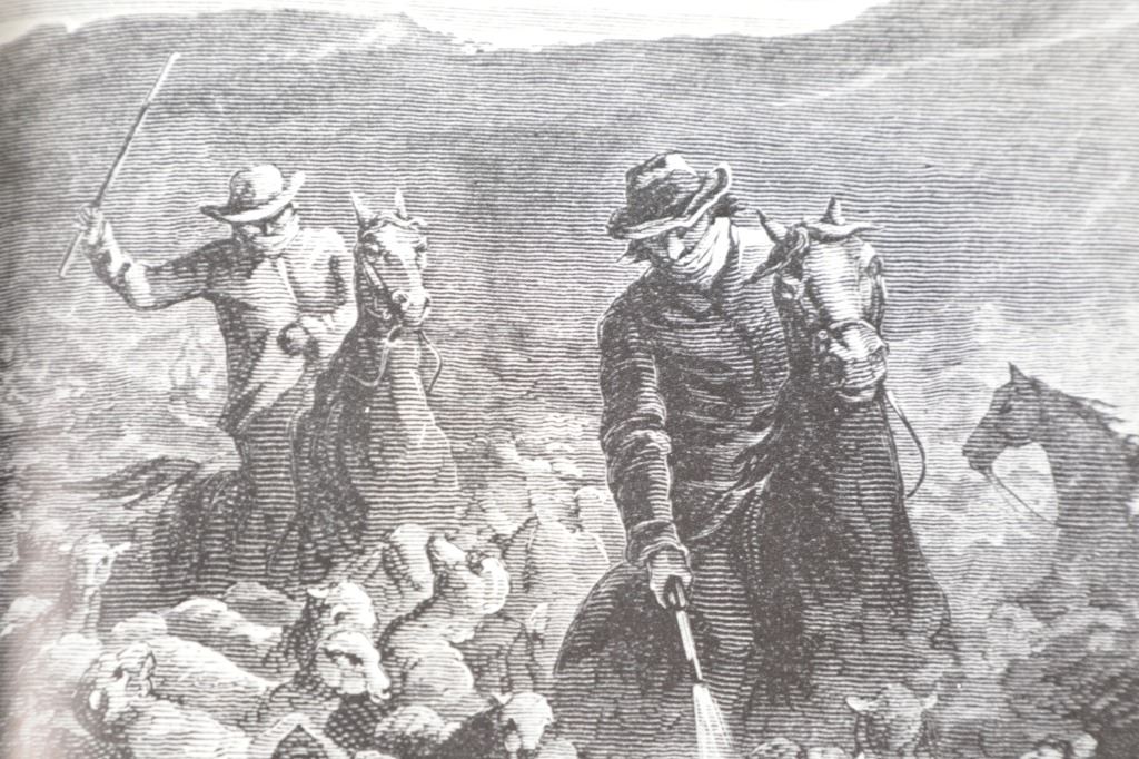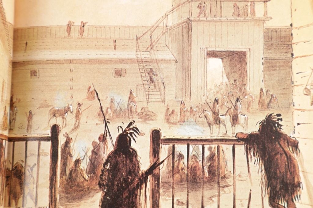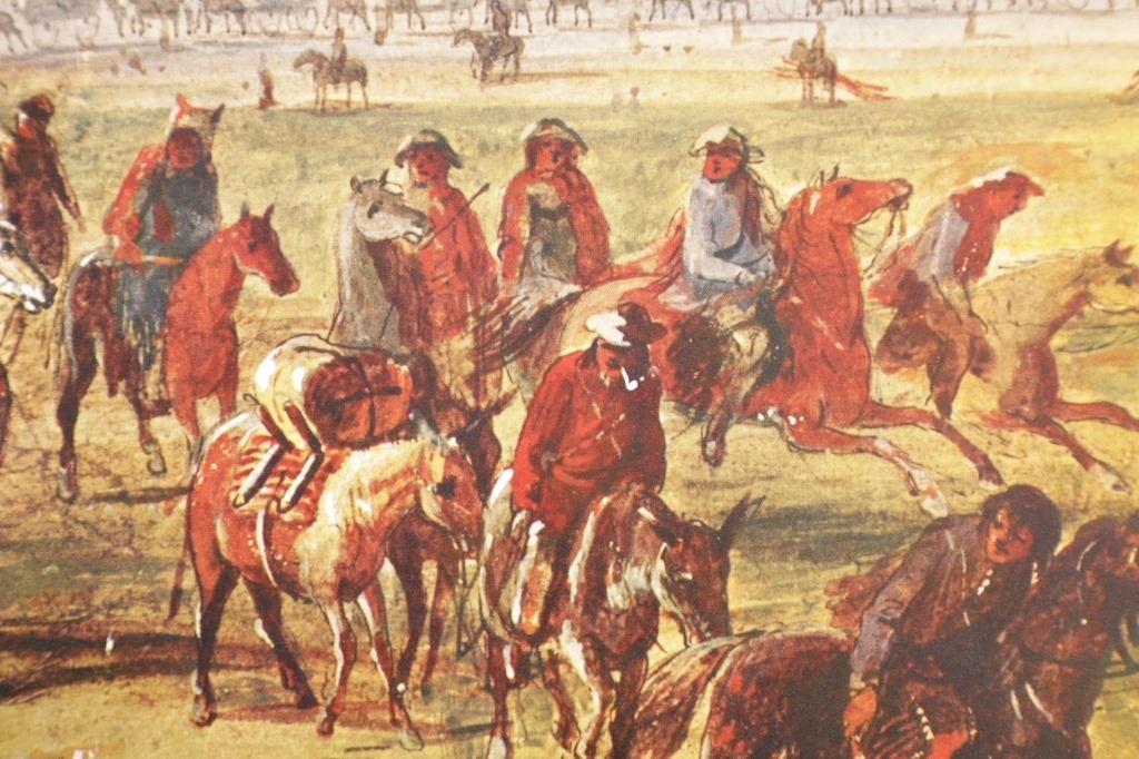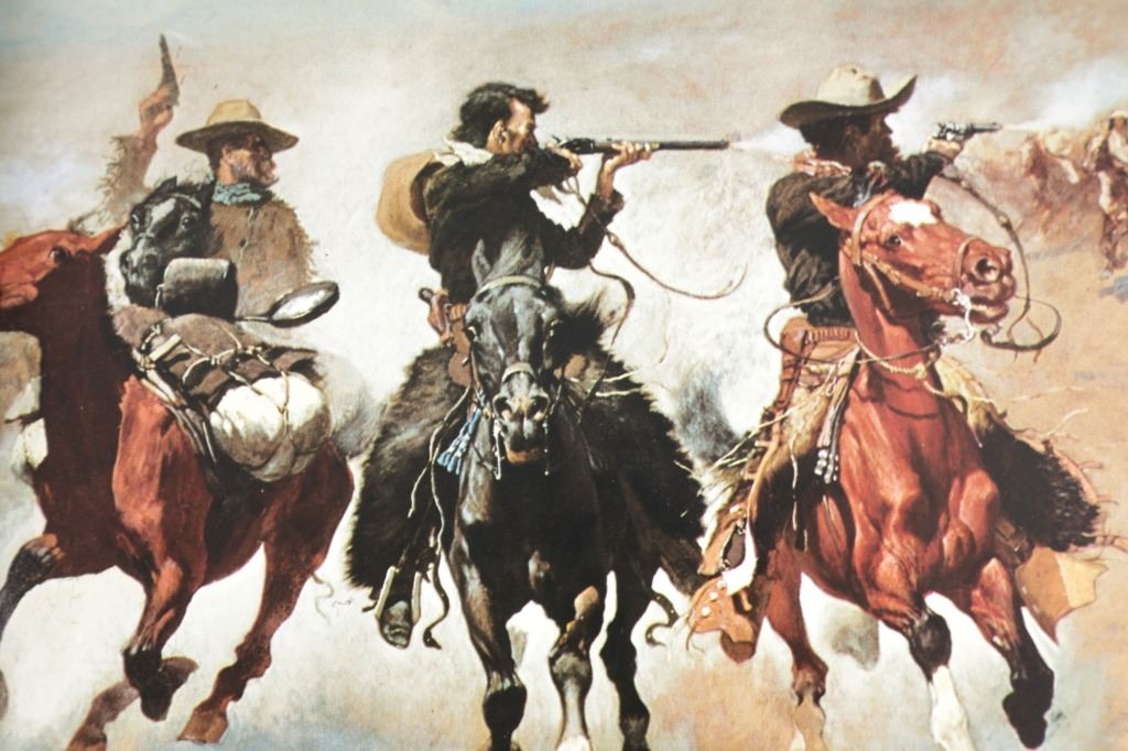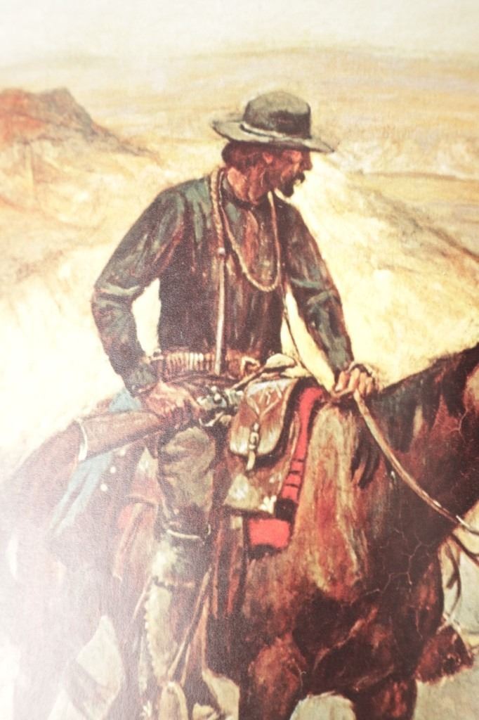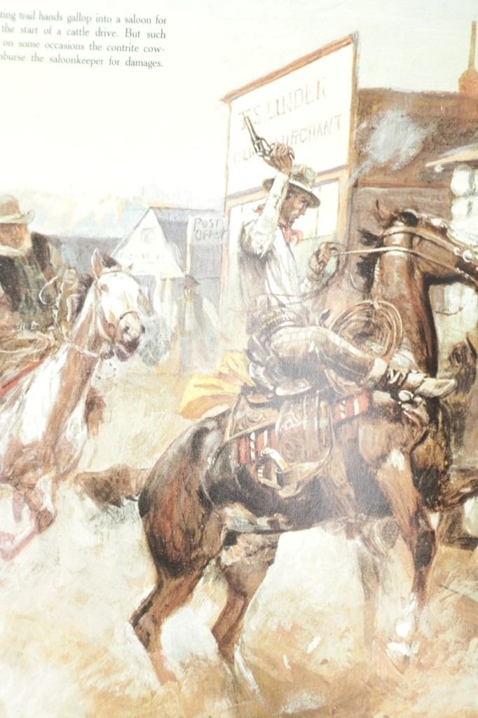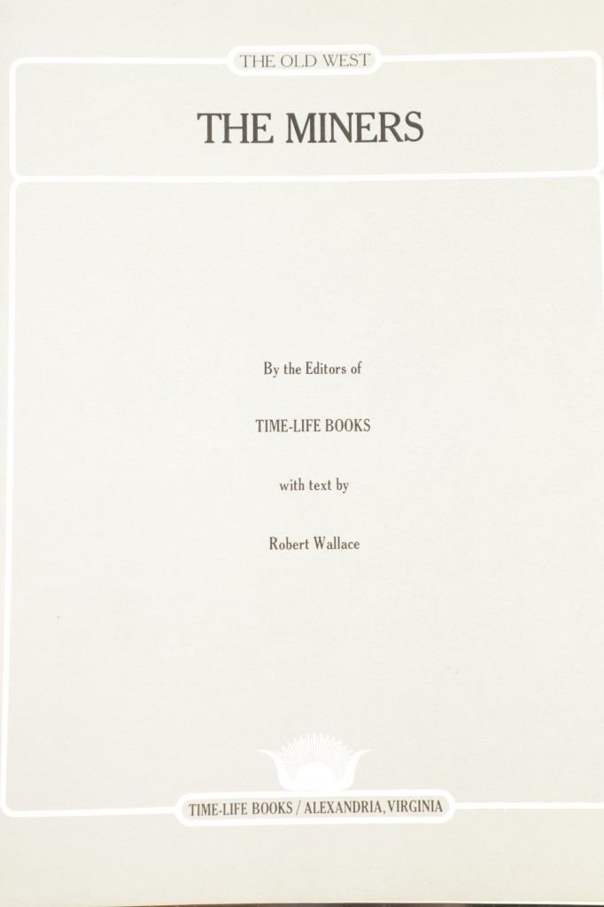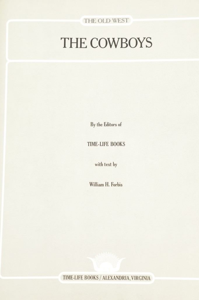 The Old West series tells the history of the American Old West era, focusing on different topics in each book such as the cowboys, Native Americans, soldiers, railroaders, women, gunfighters and many more. Each volume in the series is 240 pages long and includes numerous contemporary images and graphics. Titles include: "Loggers", "Gunfighters", "Indians", Ranchers", Women", "Pioneers", "Expressmen", "Cowboys", "Great Chiefs", "Scouts", "Miners", "Railroaders", and, "Trailblazers". They are bound in a padded faux leather hardcover binding with the series name, book title, and publisher printed in gold gilt on the spine. The front cover of the book features a glued-on oval-shaped image. A set of bull horns with a rising sun between the horns sits beneath the picture embossed in the faux leather, while the cover's outline is embossed with a rustic rope. The books show good condition overall with slight wear present from their age and use over the years, but no signs of obvious damage is noted. They each measure 11" L x 8 5/8" W x 7/8" D and have a collective weight of 27lb, 4oz