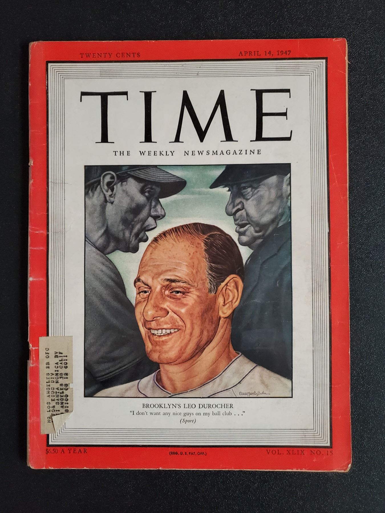 Complete Time Magazine from April 14, 1947, featuring baseball Hall of Famer Leo "the Lip" Durocher on the cover in another great Ernest Hamlin Baker painting with Leo "lipping" an umpire! Condition is overall Good.
