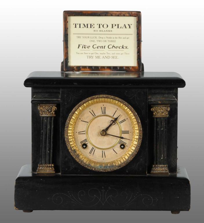 Description Five-cent machine with original clock. Condition (Excellent). Size 13" x 10" x 6 - 1/2".