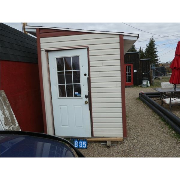 Vinyl Outside siding, shingles on roof, no window, Insulated door with glass insert. Buyer Responsible for Loading and Removal