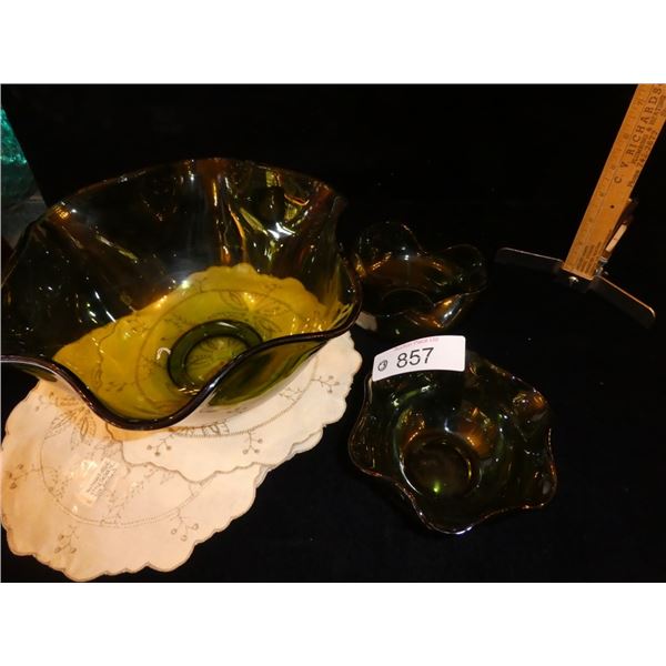 1 Large and 2 small Green Glass Bowls