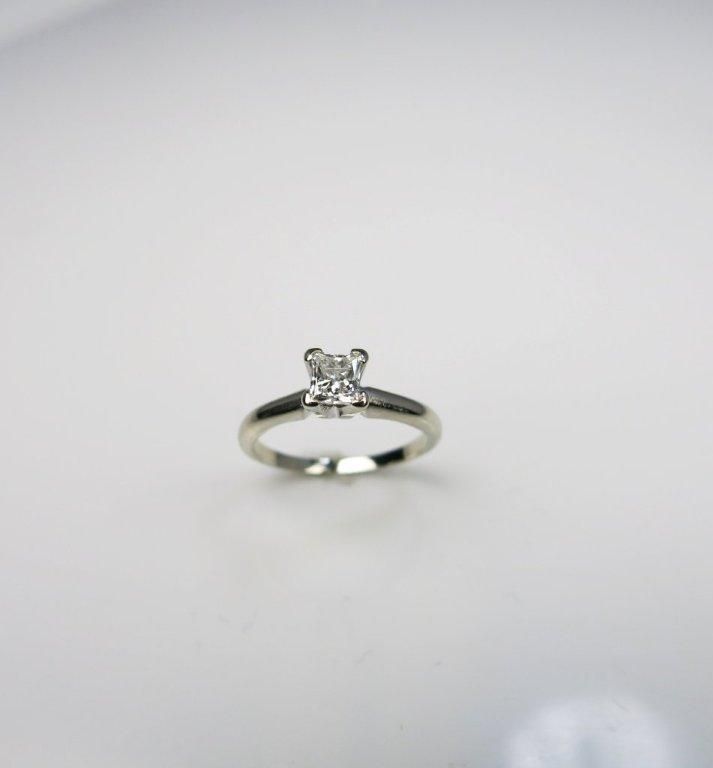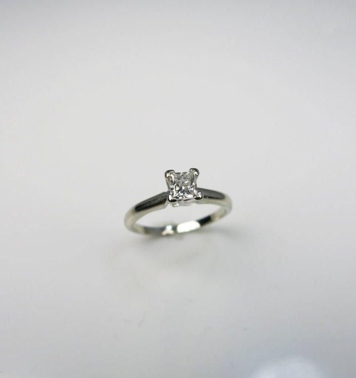 With approx 0.45 carat princess cut diamond with G-H color set in 14 karat white gold. Retail $1200-1800.