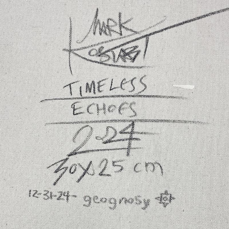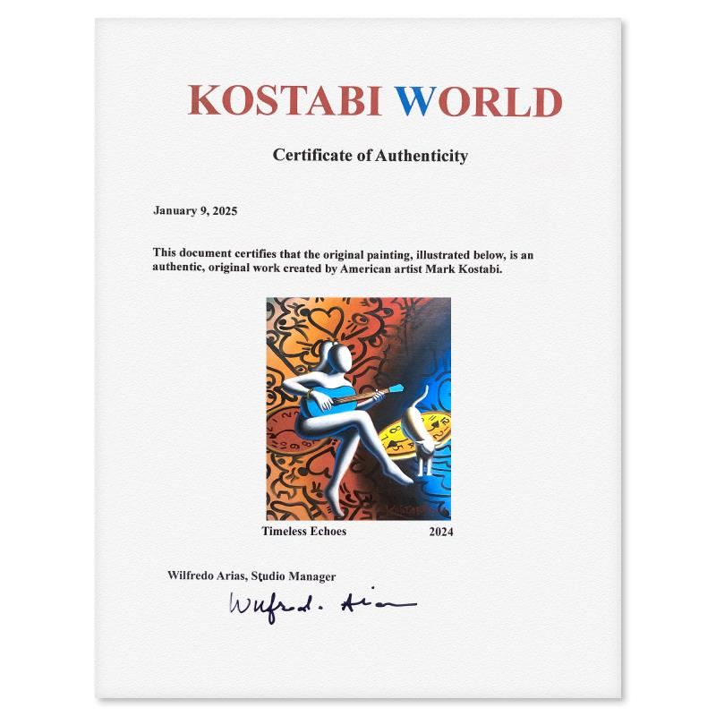 "Timeless Echoes"is an original oil painting on canvas by Mark Kostabi, hand signed by the artist. This piece comes custom framed. Includes Certificate of Authenticity. Measures approx. 22" x 20" (frame), 12" x 10" (image). This item requires special handling and may have a longer than usual turnaround.
