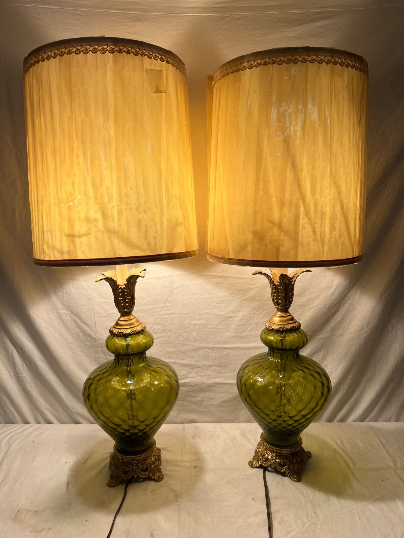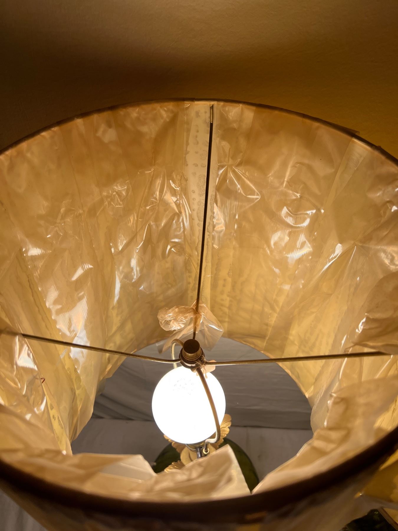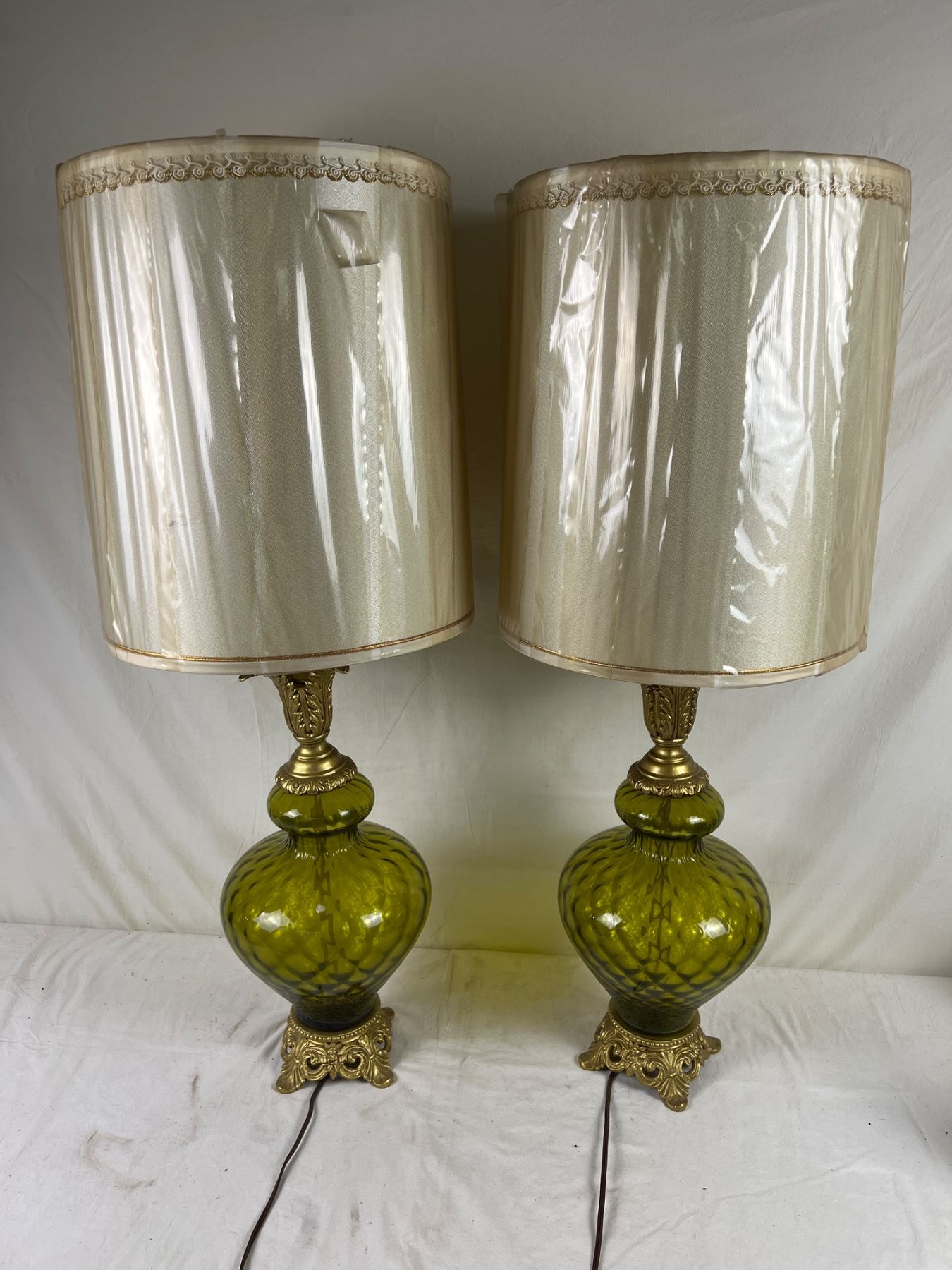 Both power on, have 3 light settings. Measures 37" tall by 13" in diameter. Brightness differs as bulbs are different. Shade still in plastic.
