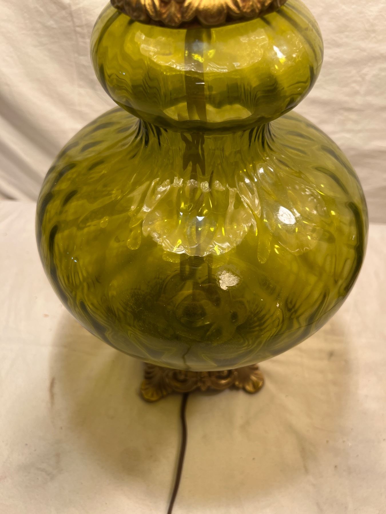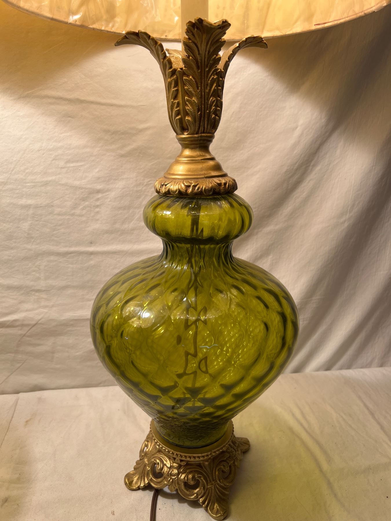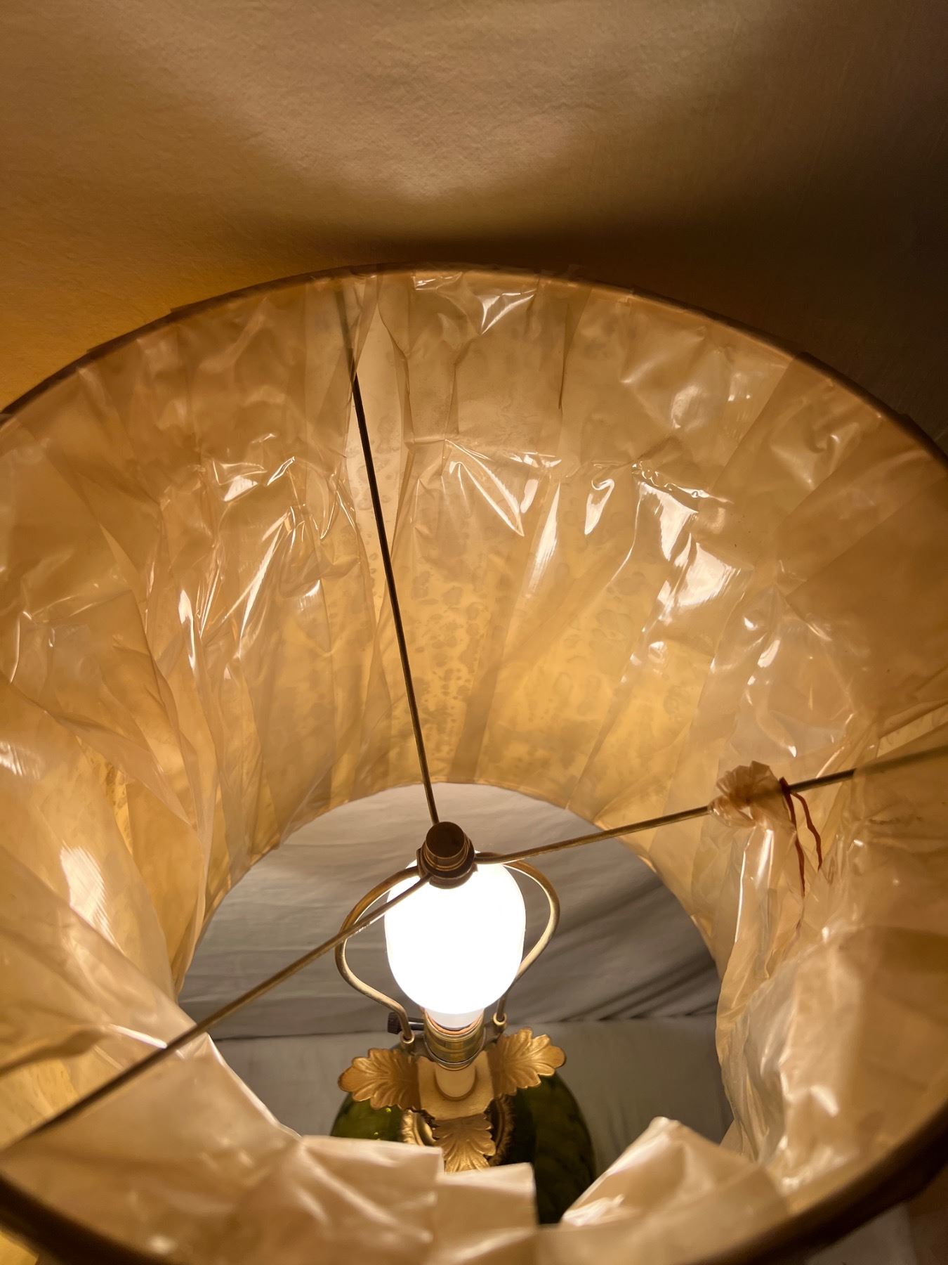 Both power on, have 3 light settings. Measures 37" tall by 13" in diameter. Brightness differs as bulbs are different. Shade still in plastic.